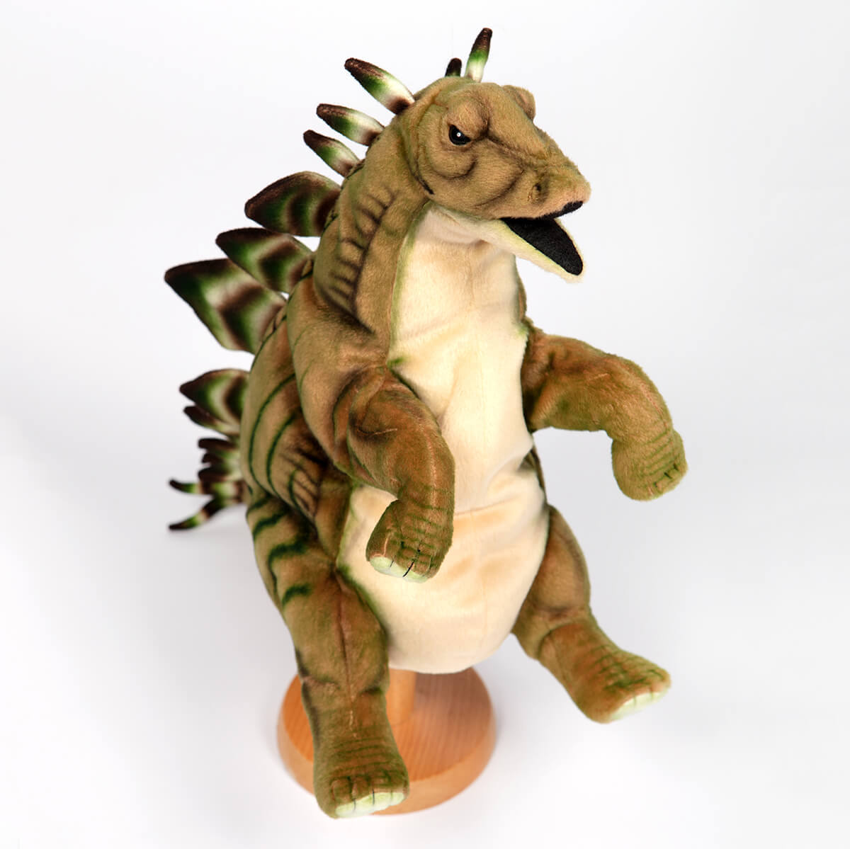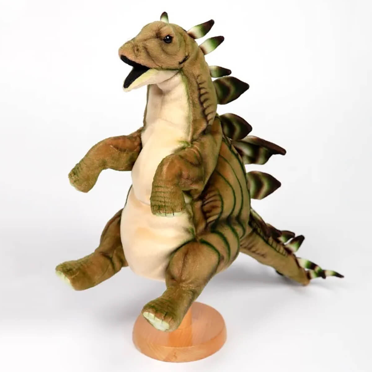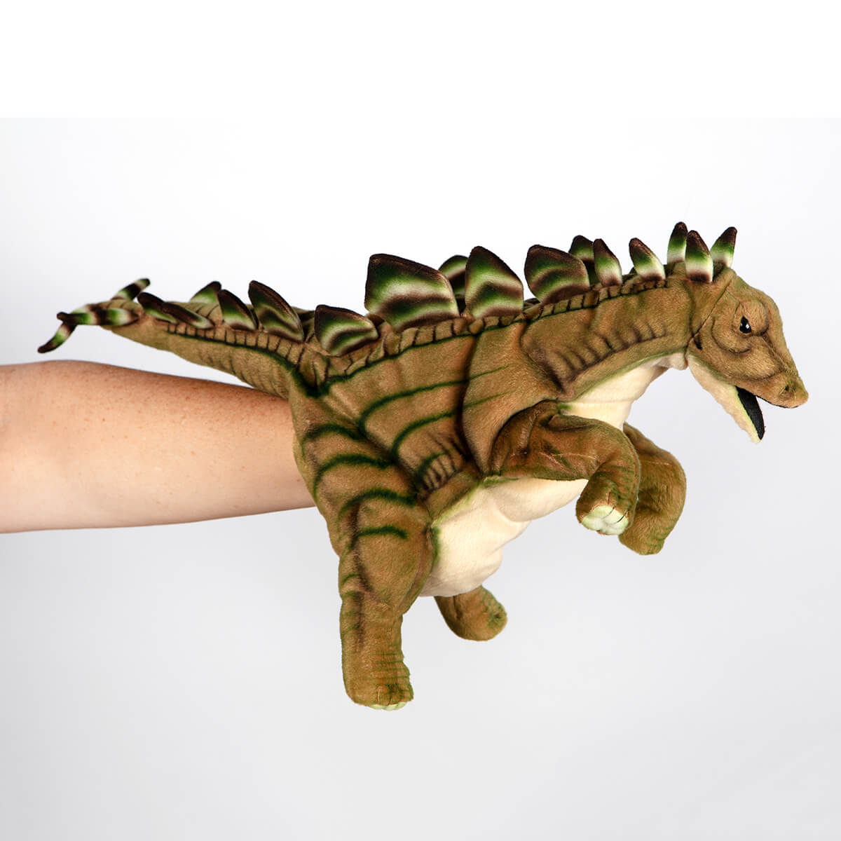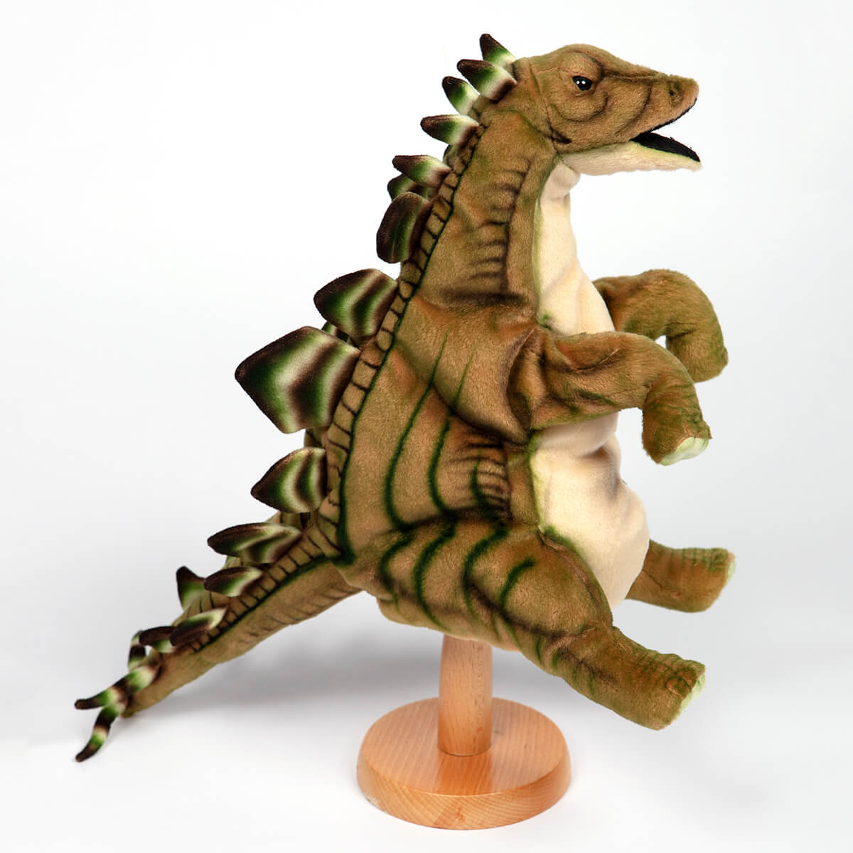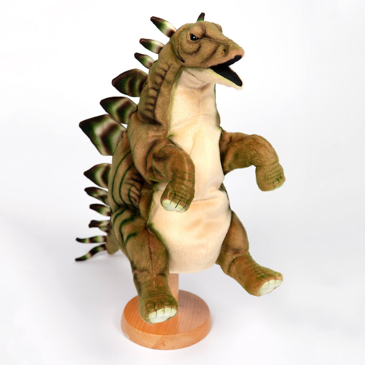 Stegosaurus hand puppet by Hansa. Heirloom quality hand crafted plush dinosaur hand puppet.