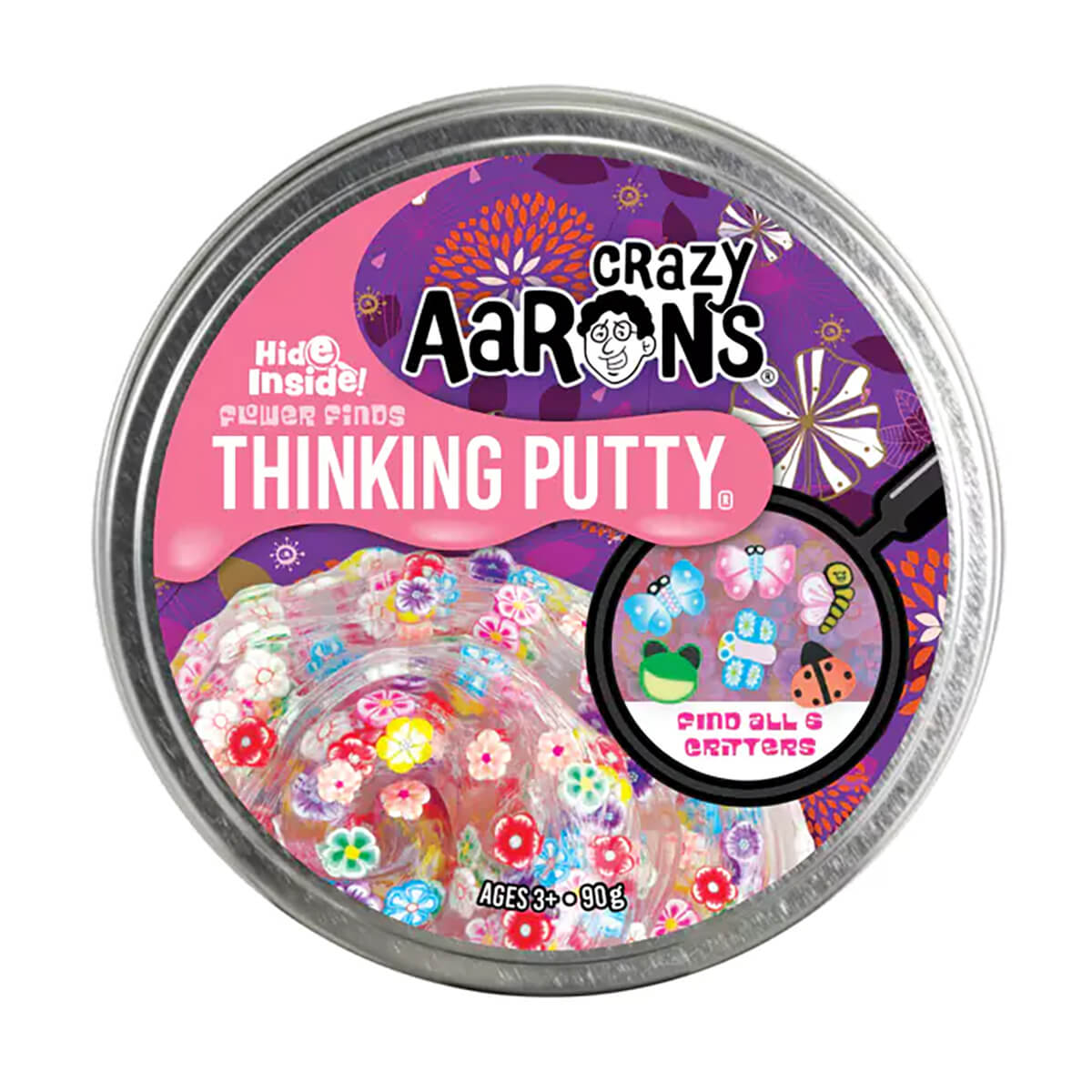 Hide Inside Flower Finds Thinking Putty by Crazy Aarons. Explore amongst the flowers - did you know there are between six and ten million different kinds of insects in the world? You will be sure to come across some little friends as you search the flower petals! If you look close enough you'll always find what you are looking for. This firm putty has a clear base with with small clay pieces inside. Stretch it, bounce it, pop it, tear it, and sculpt it!