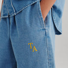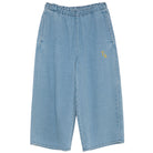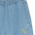 Trousers by True Artist. Denim culotte pants with a wide fit and an elasticated waistband. Featuring contrast T.A logo embroidery. Made in Spain.