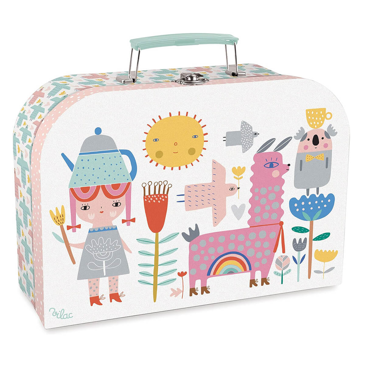 Musical tea set by Vilac. A Magical musical tea set in a sweet suitcase. Plays 'How much is that doggy in the window' when the imaginary tea is poured. No batteries required, music box winds up underneath the base of the teapot. Set contains: 1 x musical teapot, 1 x serving tray, 4 x teacups, 4 x saucers, 4 x plates. Illustrated by Suzy Ultman.