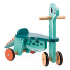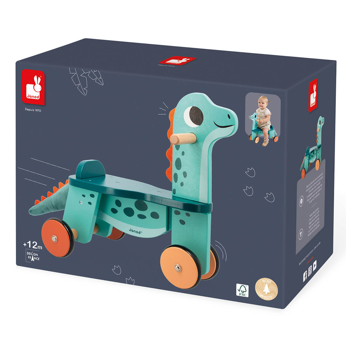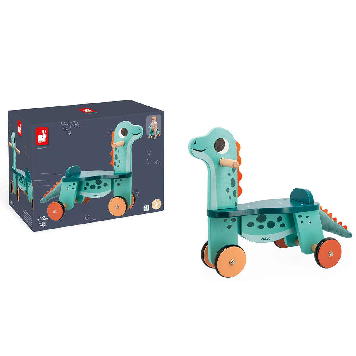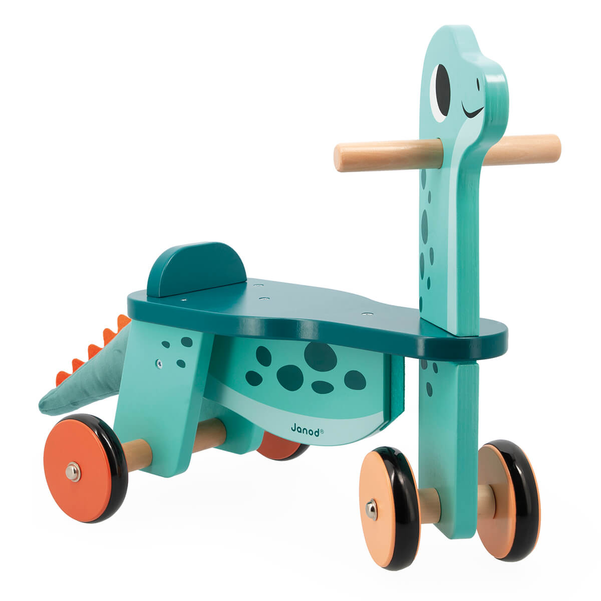 Ride on dino by Janod. Make way! The diplodocus ride-on is about to make its entrance! Children will be proud to ride a dinosaur both inside and outside the house. hildren aged 12 months and up can begin to develop their motor skills on this wooden balance bike with 4 ultra-stable wheels. The 2 front wheels move with the dinosaur's head when children want to turn. The 4 silicone-fitted wheels allow for a quieter ride. The shape of the seat (21 cm high) has been designed for children to climb on easily and sit comfortably. The natural wooden handles - protruding from the head - will help little ones stabilise themselves when going on an independent adventure.