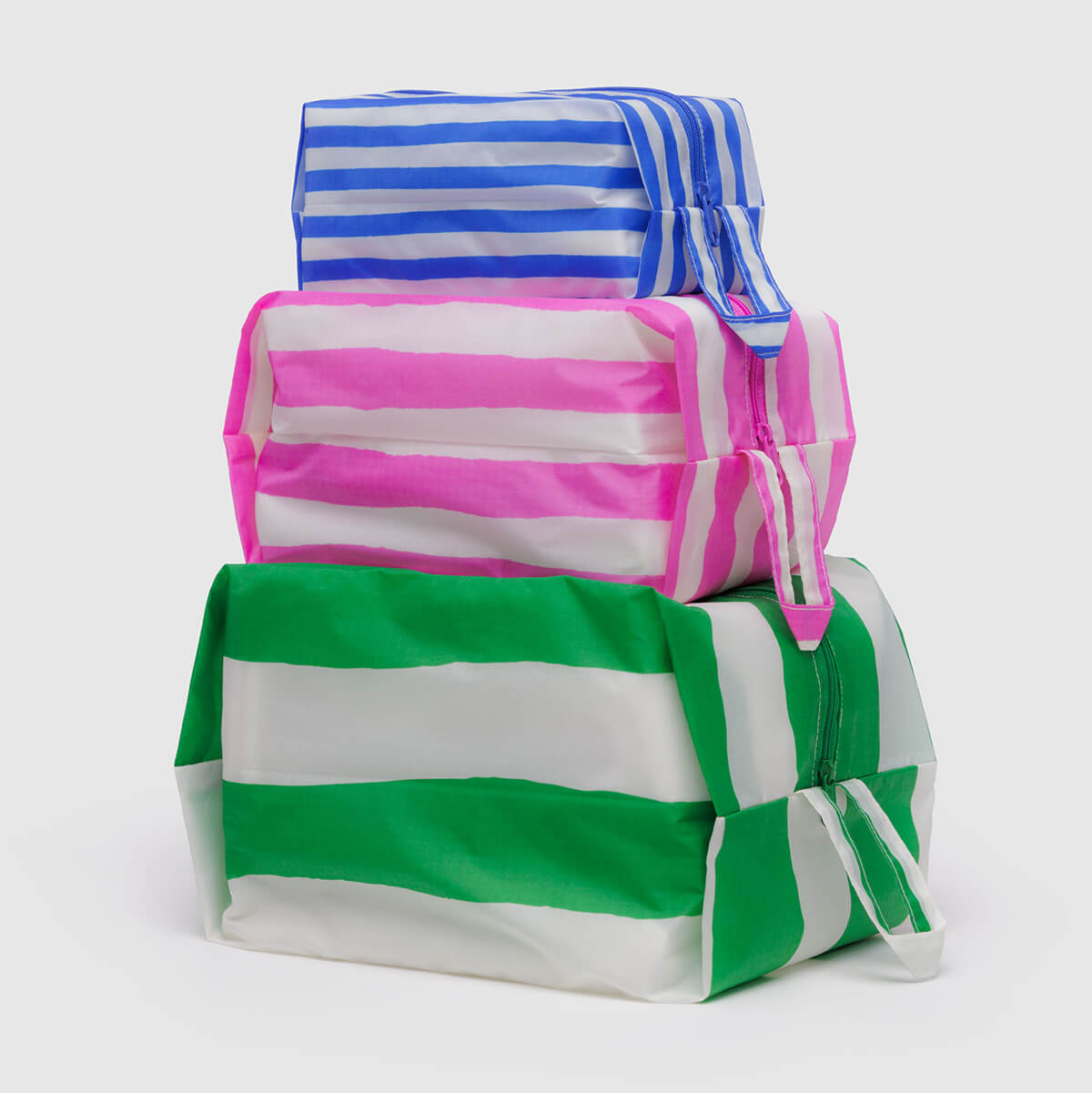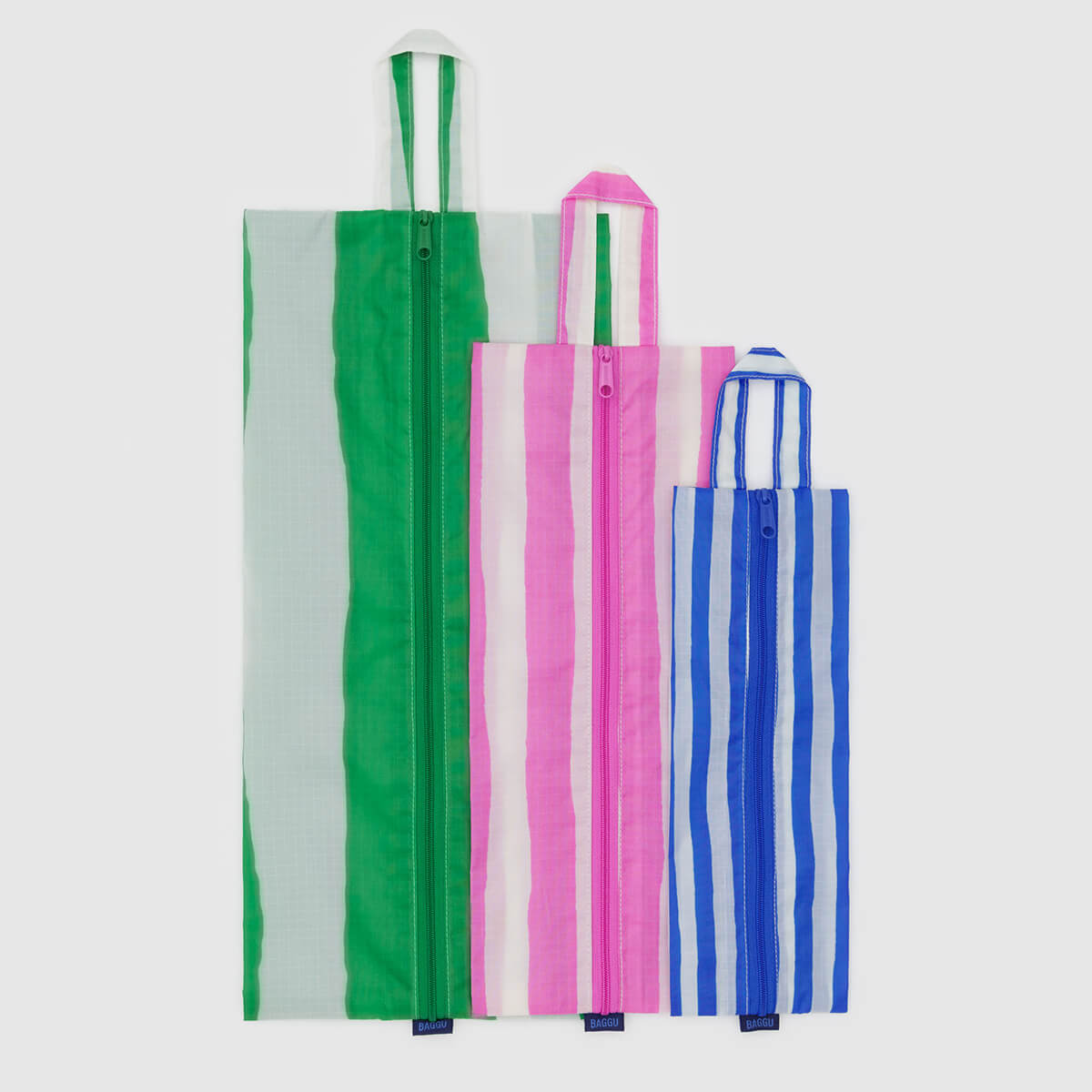3D Zip Pouch Set by Baggu. A set of three zippered pouches for travel and organization, with loops for carrying and hanging on the go. Perfect for packing, organizing your bag, or home tidying. Zip closure.