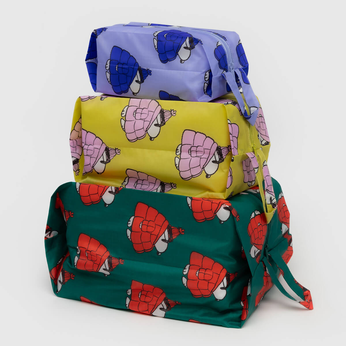 3D Zip Pouch Set by Baggu. A set of three zippered pouches for travel and organization, with loops for carrying and hanging on the go. Perfect for packing, organizing your bag, or home tidying. Zip closure.