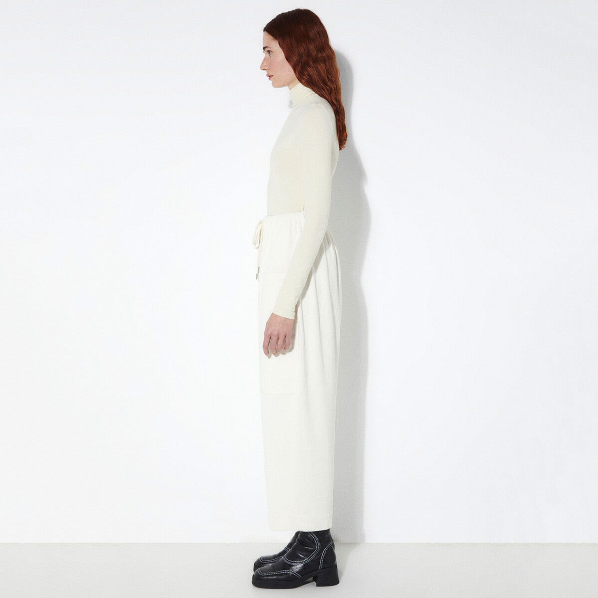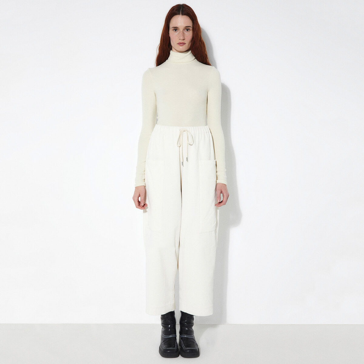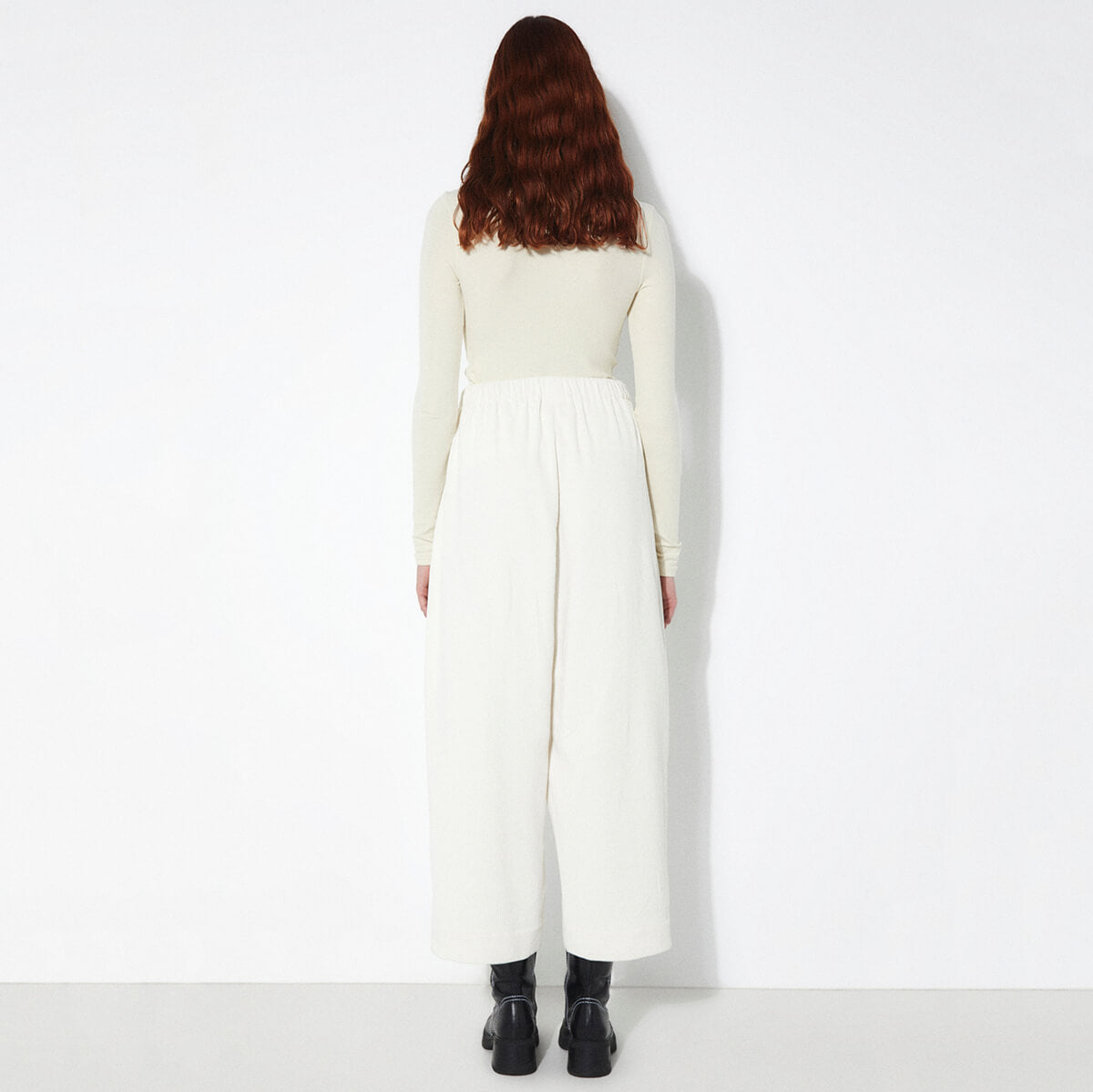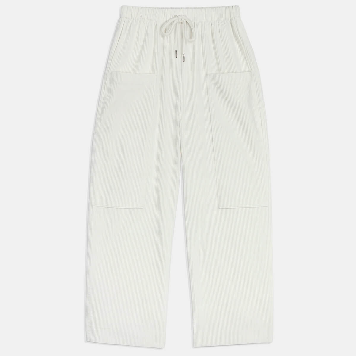Esther Pants by Rita Row. Wide, high-waisted corduroy pants. Elastic waist with drawstring for a better fit. Side cargo pockets, barrel style legs.