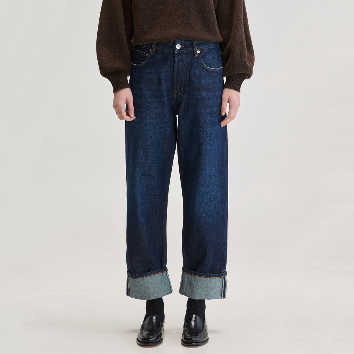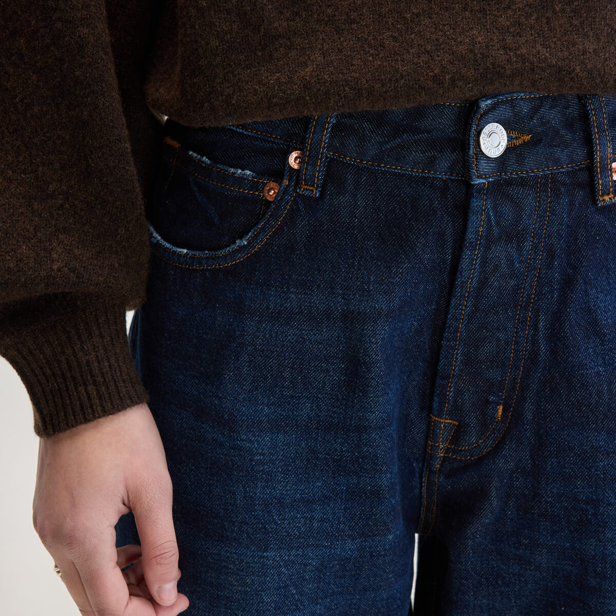 Kurt Jeans by Bellerose. 5 pocket relaxed fit denim trousers in a dark blue rinse.