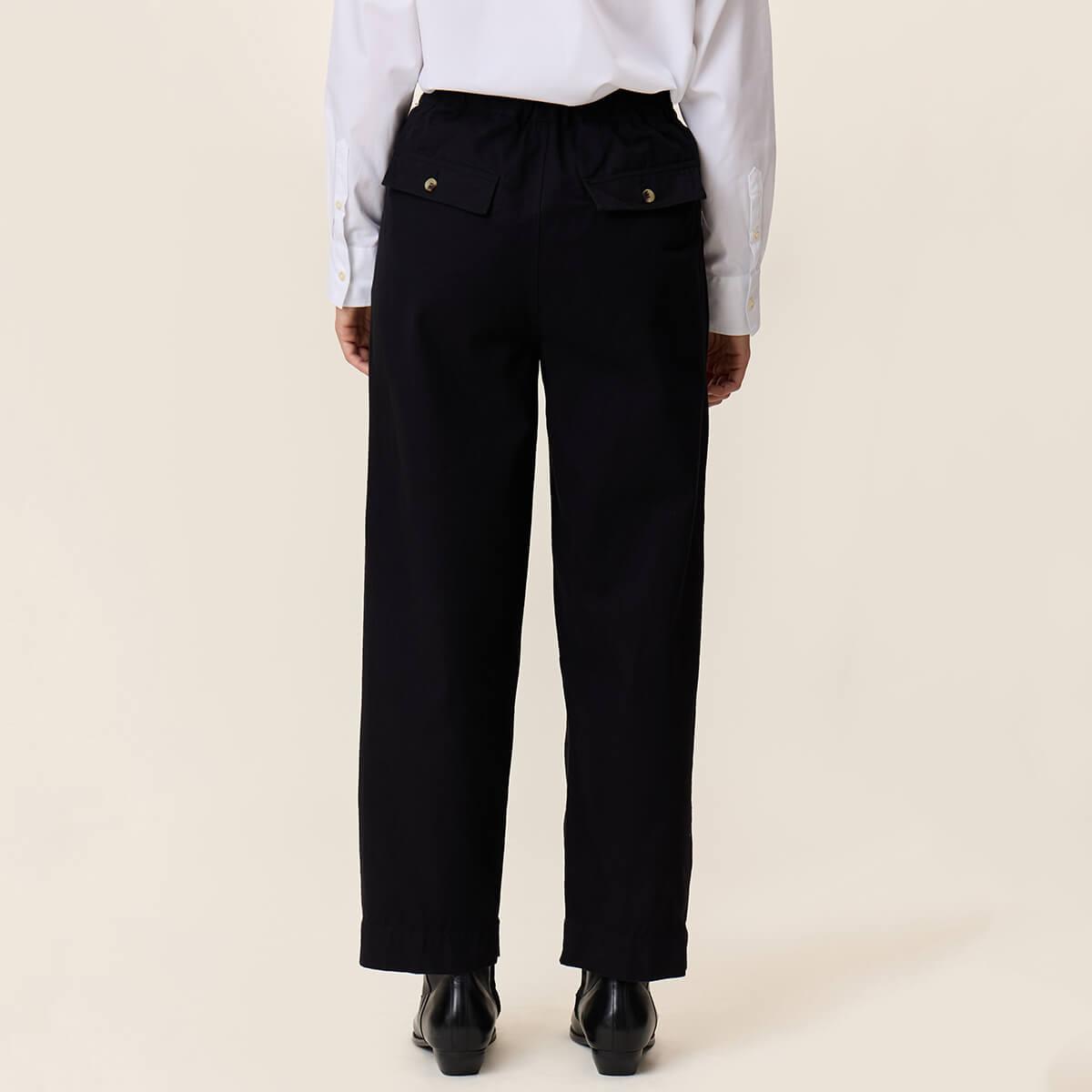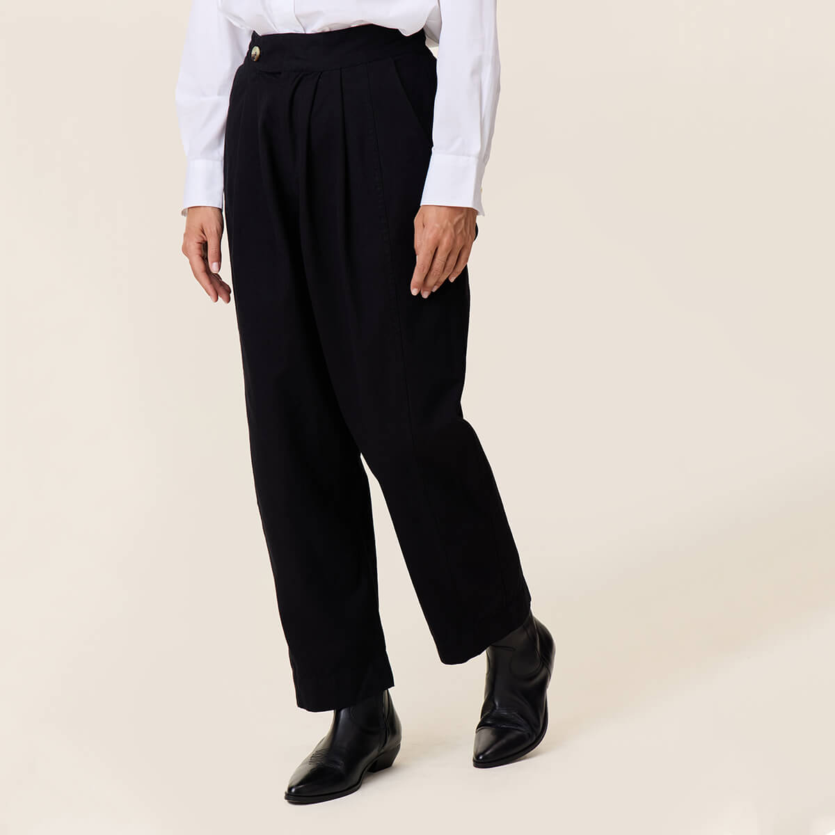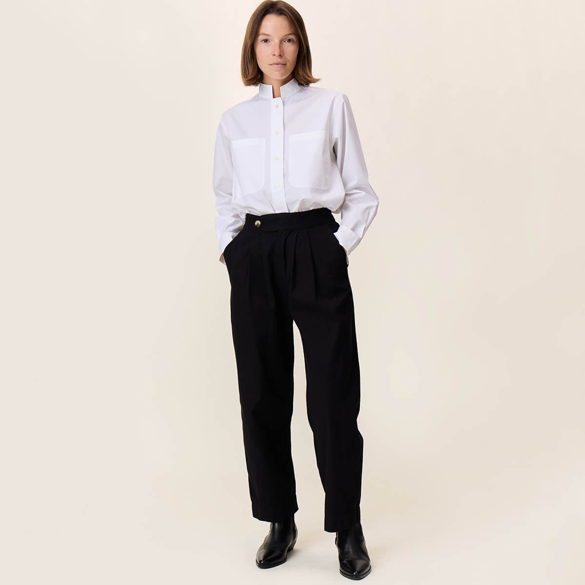 Penelope Trousers by Leon & Harper. The Penelope trousers are a wardrobe essential with their fluid drape and straight cut. The front darts shape the silhouette while maintaining the casual spirit of the piece. The side pockets and buttoned back pockets combine practicality and style, while the hem cuff emphasizes a precise finish. Made from 100% cotton, they ensure everyday comfort and great freedom of movement.