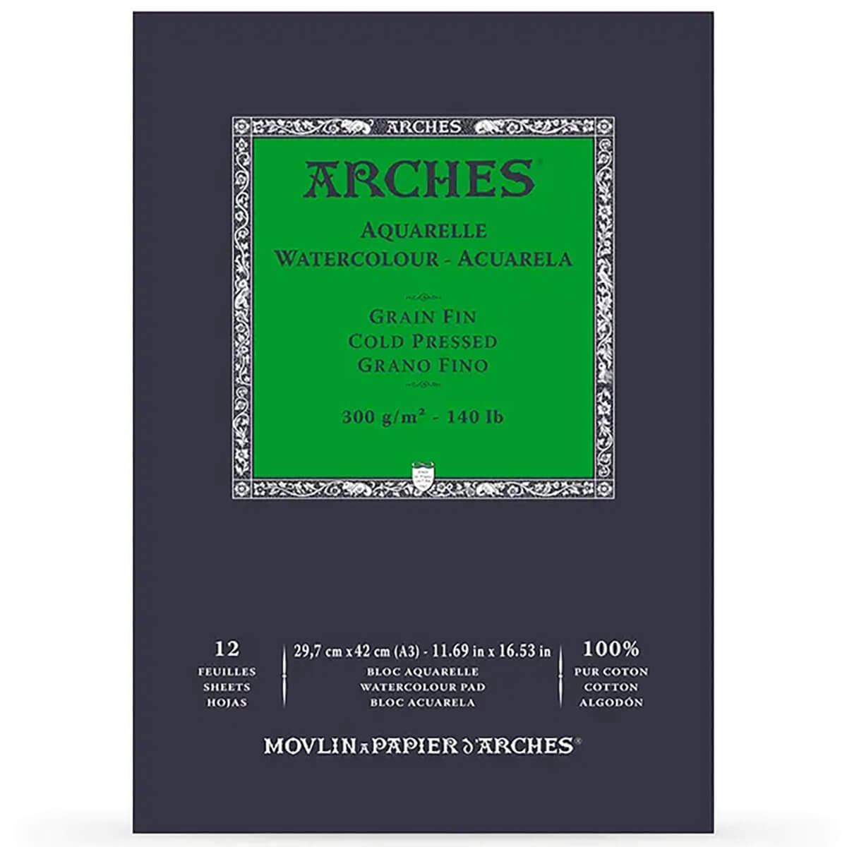 Arches Cold Pressed Watercolour Pad by RK Burt. Cold pressed, otherwise known as Not/Fine Grain watercolour paper is the medium textured watercolour paper which is suitable for all painting styles. Gummed pad with 12 sheets.