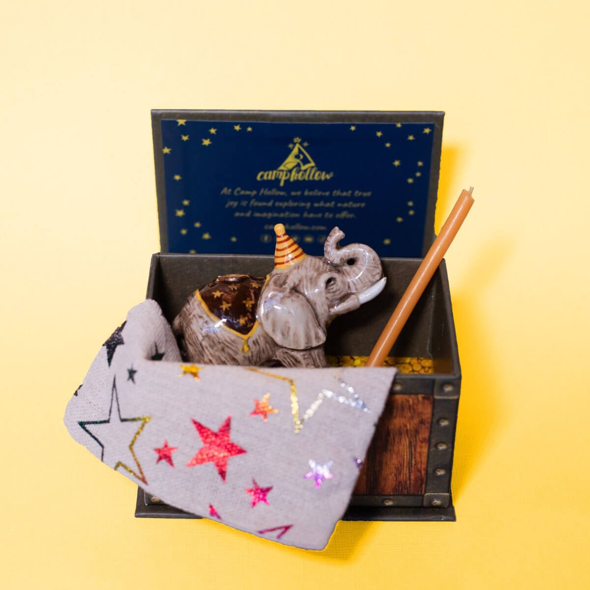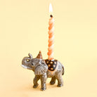 Elephant ceramic cake topper by Camp Hollow. Crafted in fine porcelain and meticulously hand-painted, this beautiful heirloom quality candle holder will celebrate every birthday and occasion for years to come.