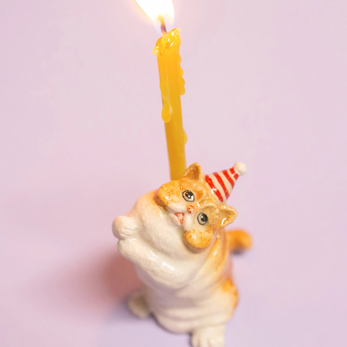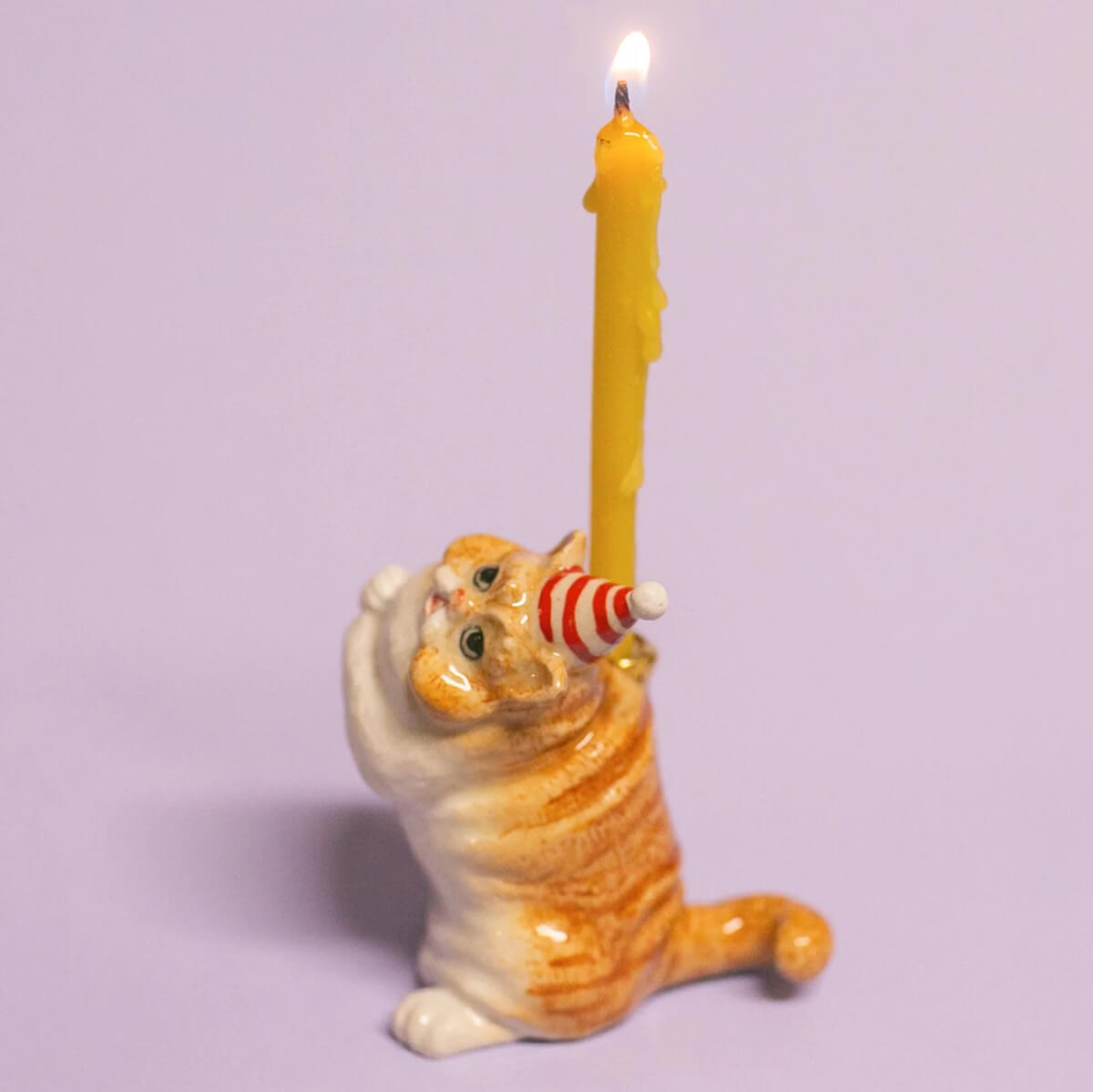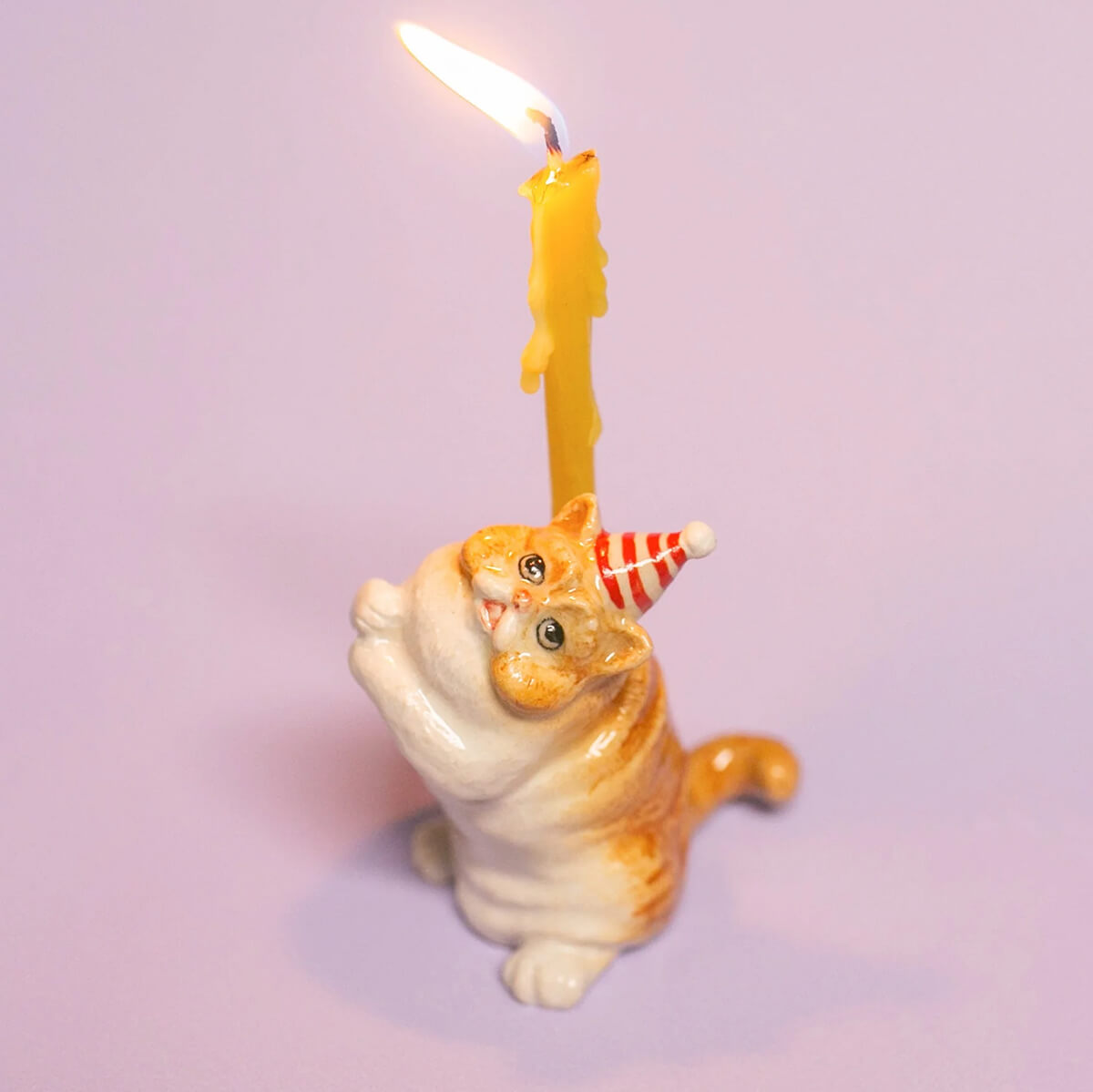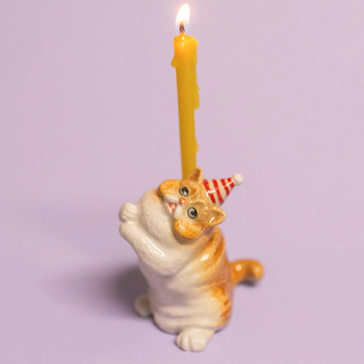 Exotic Shorthair Cat ceramic cake topper by Camp Hollow. This porcelain cake topper adds a whimsical touch to any celebration, featuring an adorable Exotic Shorthair cat wearing a festive striped party hat. Made from high-quality, food-safe materials, it is ideal for birthdays, cat-themed parties, and special occasions. The lifelike design and intricate details make it a delightful keepsake long after the event. Add a unique and fun touch to your cake with this adorable topper. Crafted in fine porcelain and meticulously hand-painted, this beautiful heirloom quality candle holder will celebrate every birthday and occasion for years to come.