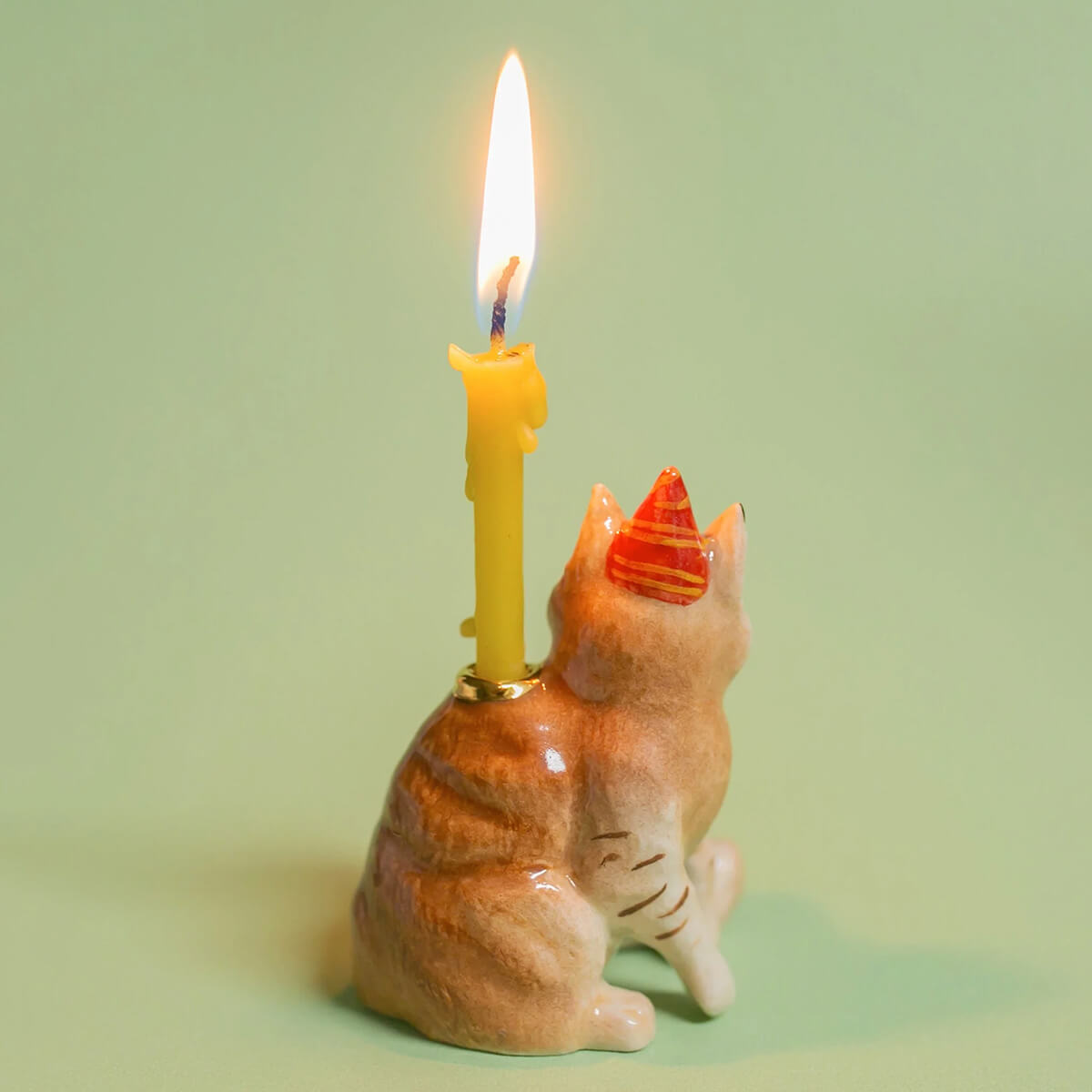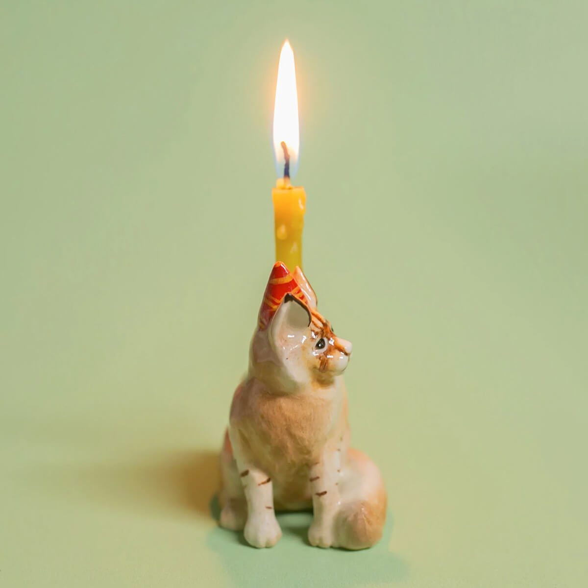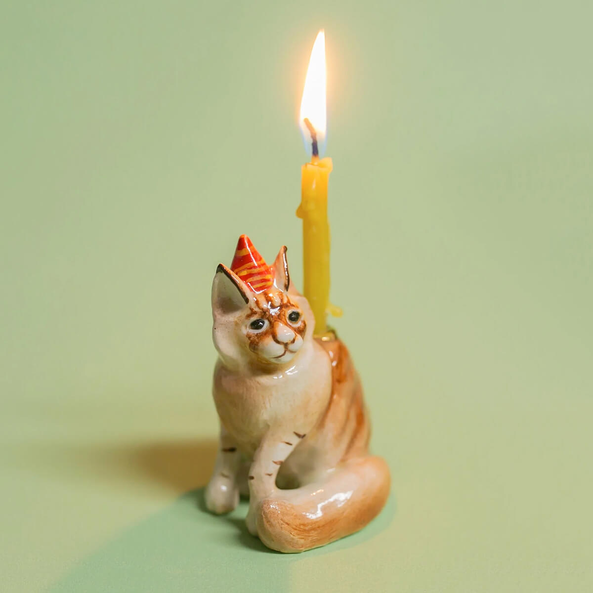 Maine Coon Cat ceramic cake topper by Camp Hollow. This porcelain cake topper brings a playful and charming element to any celebration, featuring a beautifully crafted Maine Coon cat wearing a festive party hat. Made from high-quality, food-safe materials, it is ideal for birthdays, cat-themed parties, and special occasions. The lifelike design and intricate details make it a delightful keepsake long after the event. Add a unique and fun touch to your cake with this adorable topper. Crafted in fine porcelain and meticulously hand-painted, this beautiful heirloom quality candle holder will celebrate every birthday and occasion for years to come.