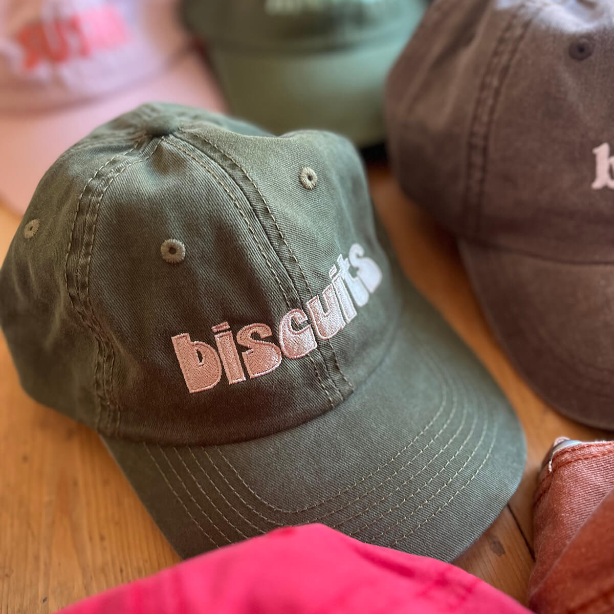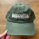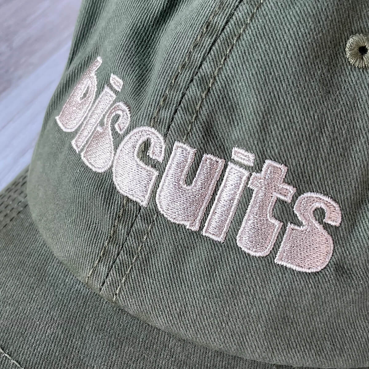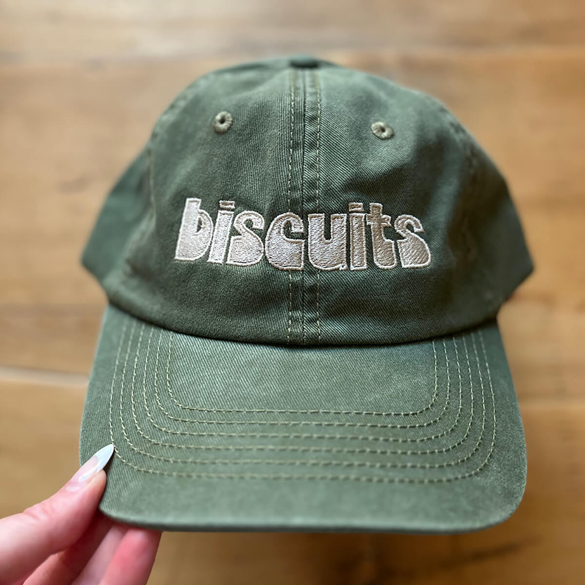 Biscuits Baseball Cap by The Silver Spider. This vintage style 'dad' hat is designed to fit all biscuit lovers. Washed olive pigment dyed baseball cap with embroidered 'Biscuits' design in cream, complete with an adjustable strap.