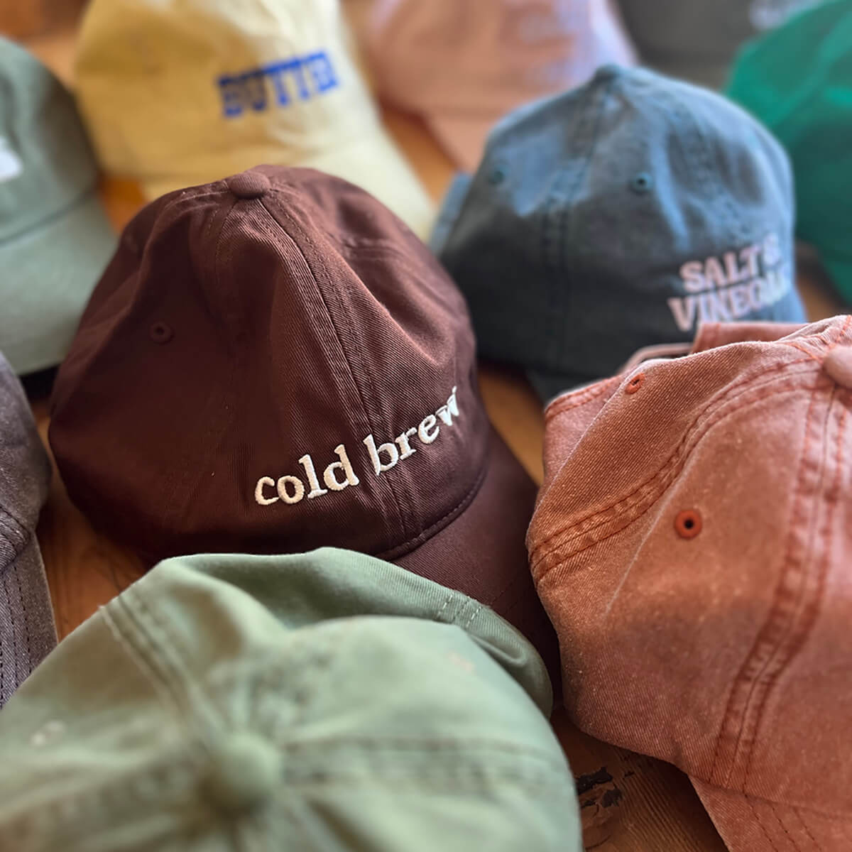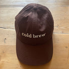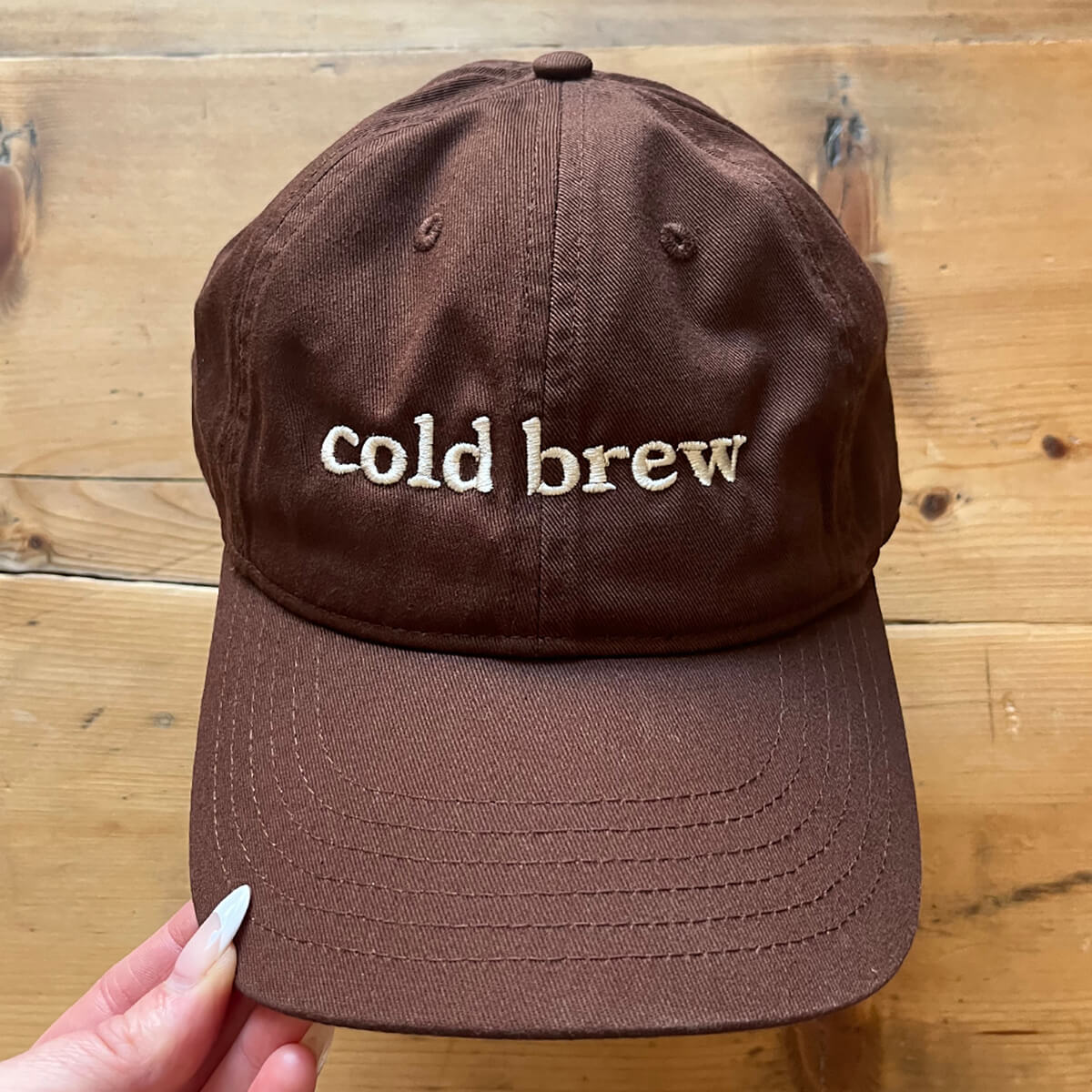 Cold Brew Baseball Cap by The Silver Spider. This vintage style 'dad' hat is designed to fit all coffee lovers. Brown baseball cap with embroidered 'Cold Brew' design in white, complete with an adjustable strap.