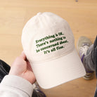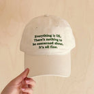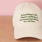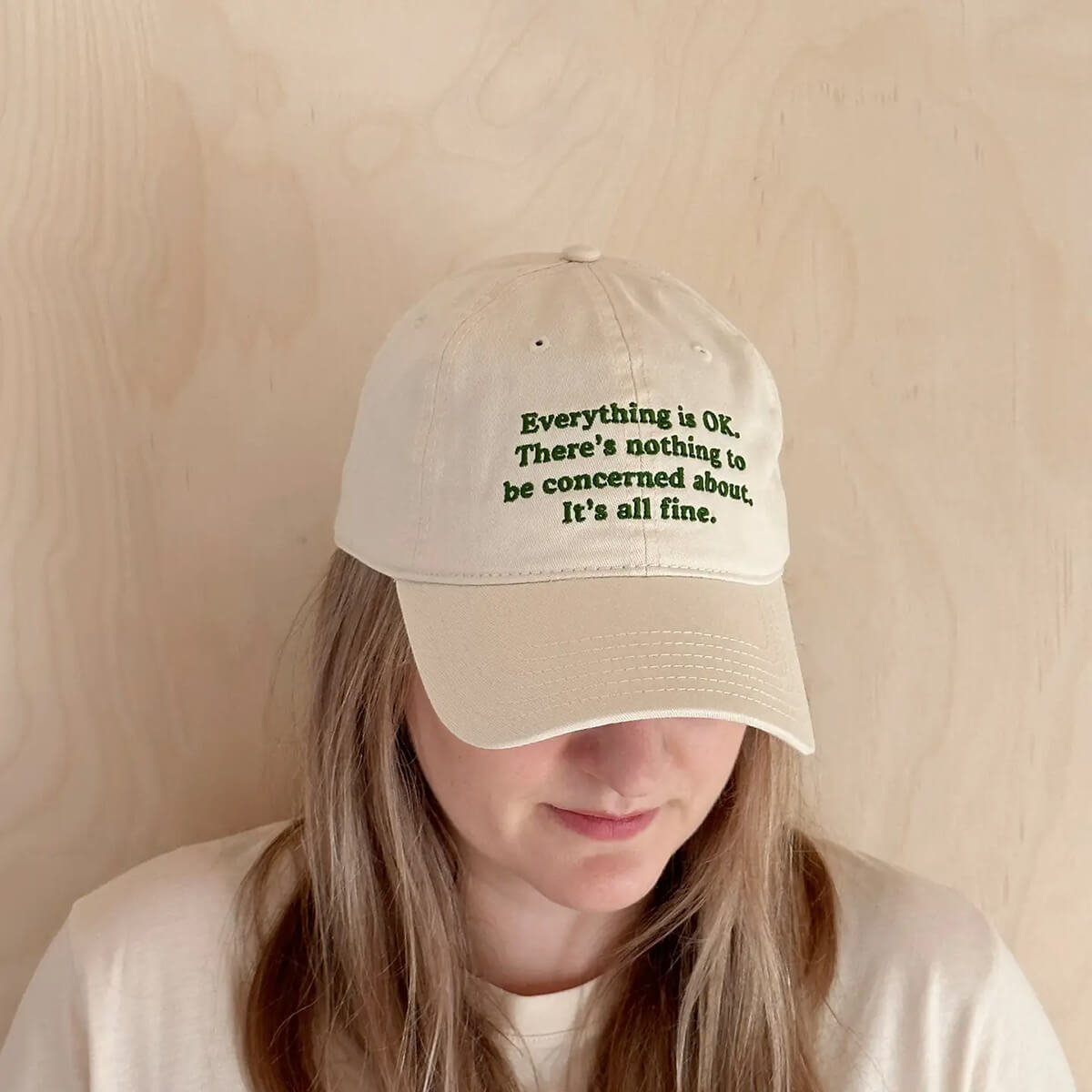 Everything is OK Baseball Cap by Alphabet Bags. Everything is OK. There's nothing to be concerned about. It's all fine. Keep telling yourself this, whether you're on the school run, a big family day out or simply facing whatever life is currently throwing at you.