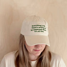 Expertly embroidered in deep green thread on a timeless off-white cotton cap. This 'dad fit' cap is a fun gift for friends, family, or anyone who is juggling everyday life.