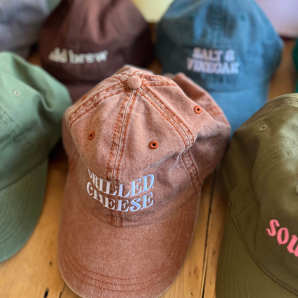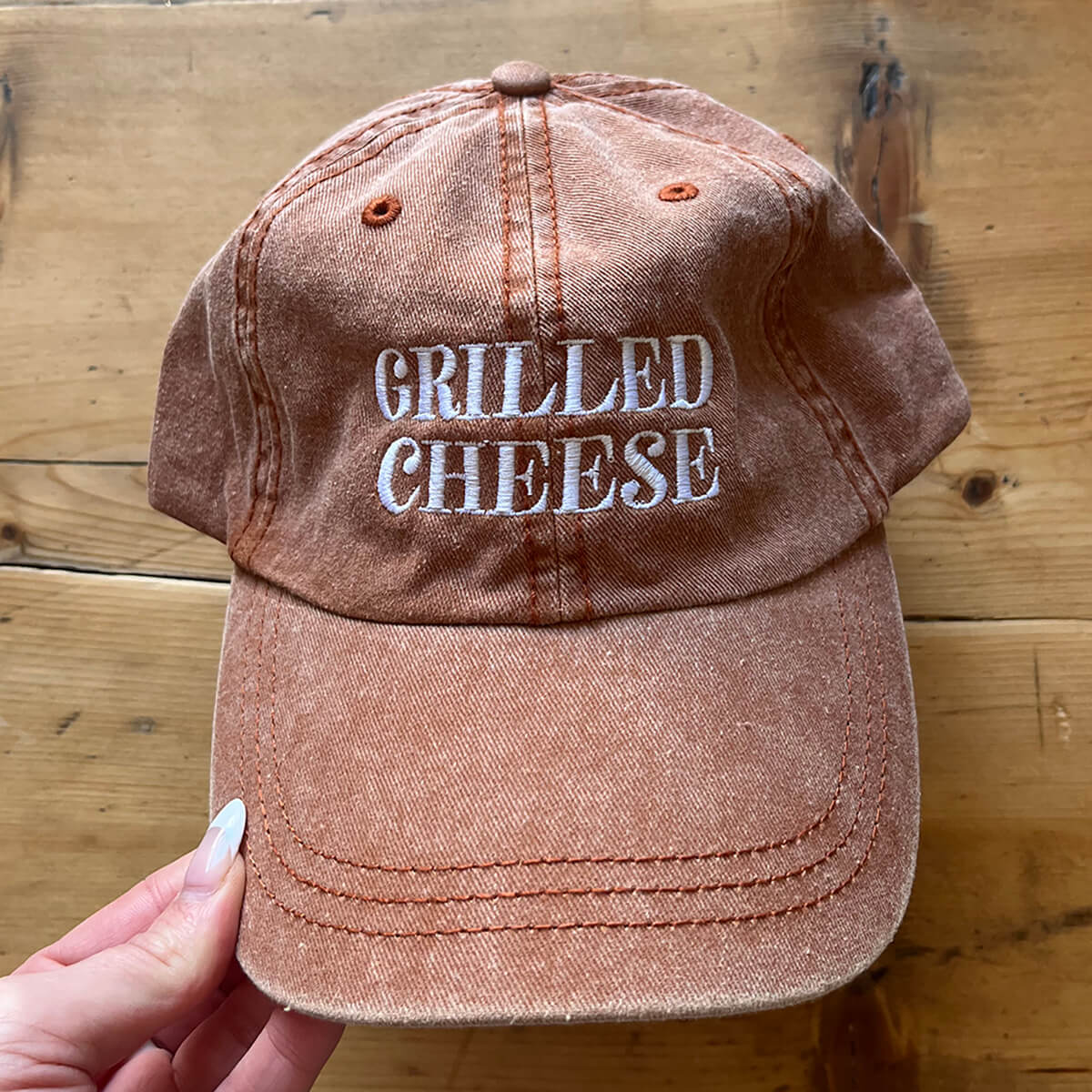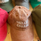 Grilled Cheese Baseball Cap by The Silver Spider. This vintage style 'dad' hat is designed to fit all grilled cheese lovers. Orange pigment dyed baseball cap with embroidered 'Grilled Cheese' design in white, complete with an adjustable strap.