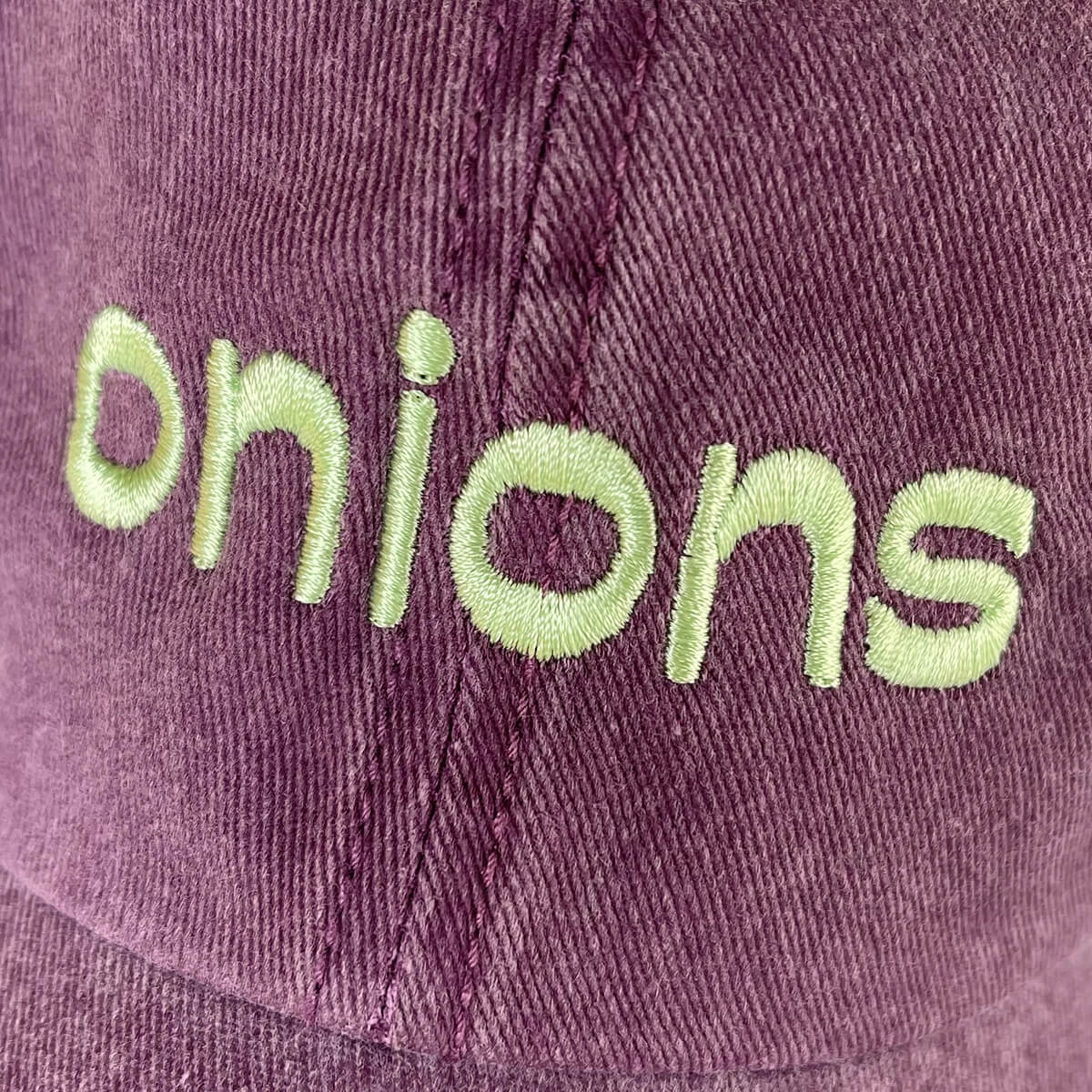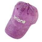 Onions Baseball Cap by The Silver Spider. This vintage style 'dad' hat is designed to fit all onion lovers. Purple pigment dyed baseball cap with embroidered 'Onions' design in green, complete with an adjustable strap.