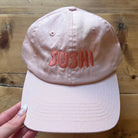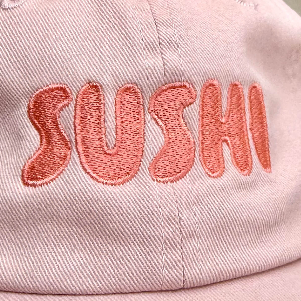 Sushi Baseball Cap by The Silver Spider. This vintage style 'dad' hat is designed to fit all sushi lovers. Light pink pigment dyed baseball cap with embroidered 'Sushi' design in salmon, complete with an adjustable strap.