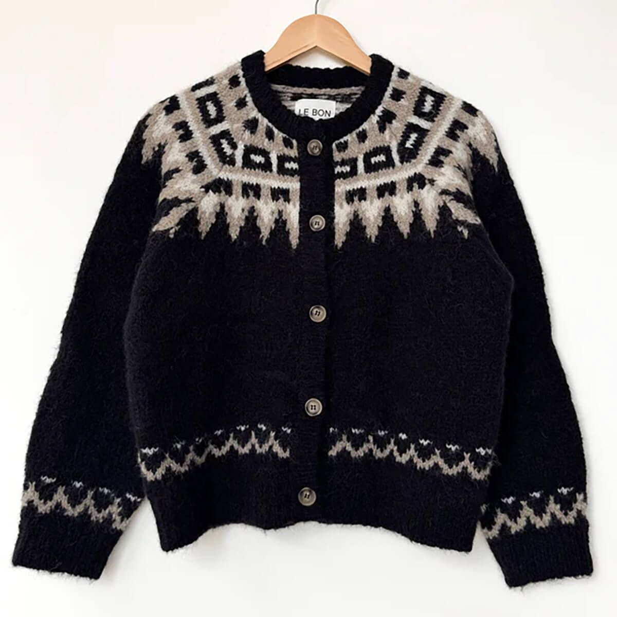 Alpaca Cabin Cardigan by Le Bon Shoppe. The reimagined nostalgic sweater, made to keep you warm. Crafted from an ultra-cosy alpaca blend, the Cabin Cardigan features a dreamy fair isle pattern, functional front buttons, and a relaxed fit. Perfect for layering through the cooler months.