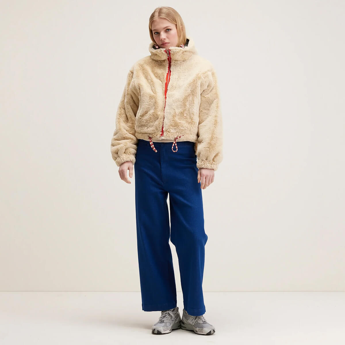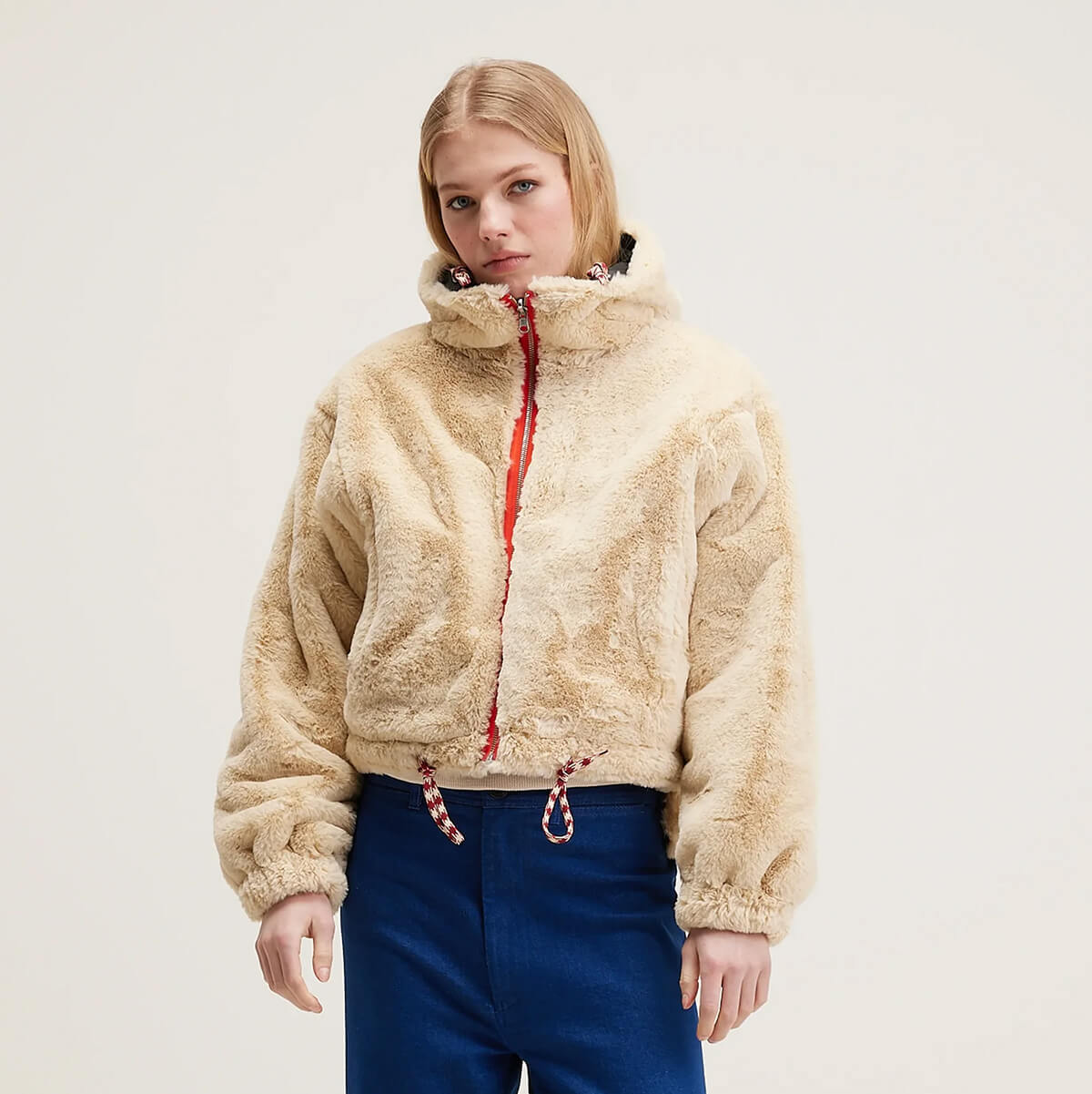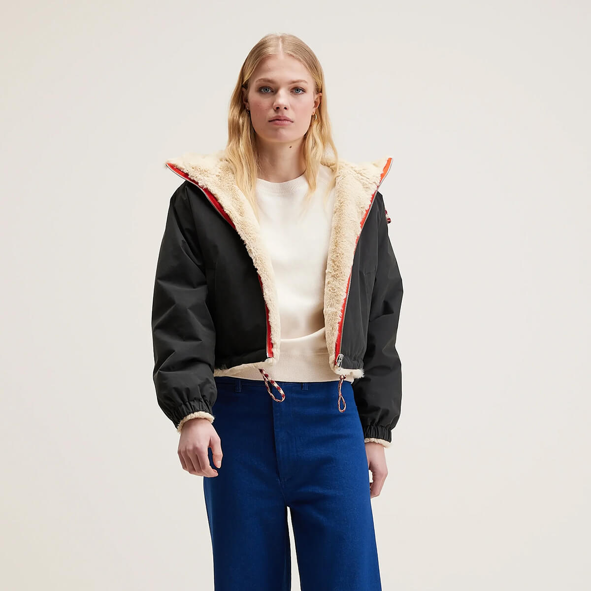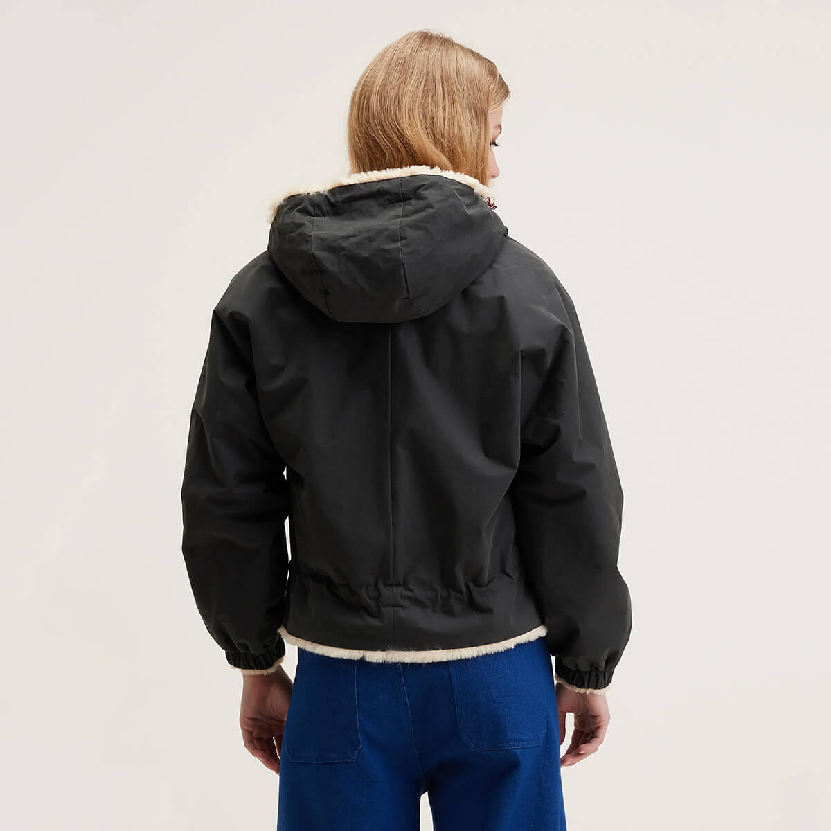 Loud Reversible Hooded Jacket by Bellerose. Reversible hooded coat in navy blue canvas with hood and lined with ecru faux fur.