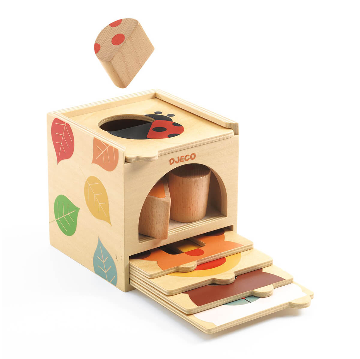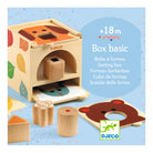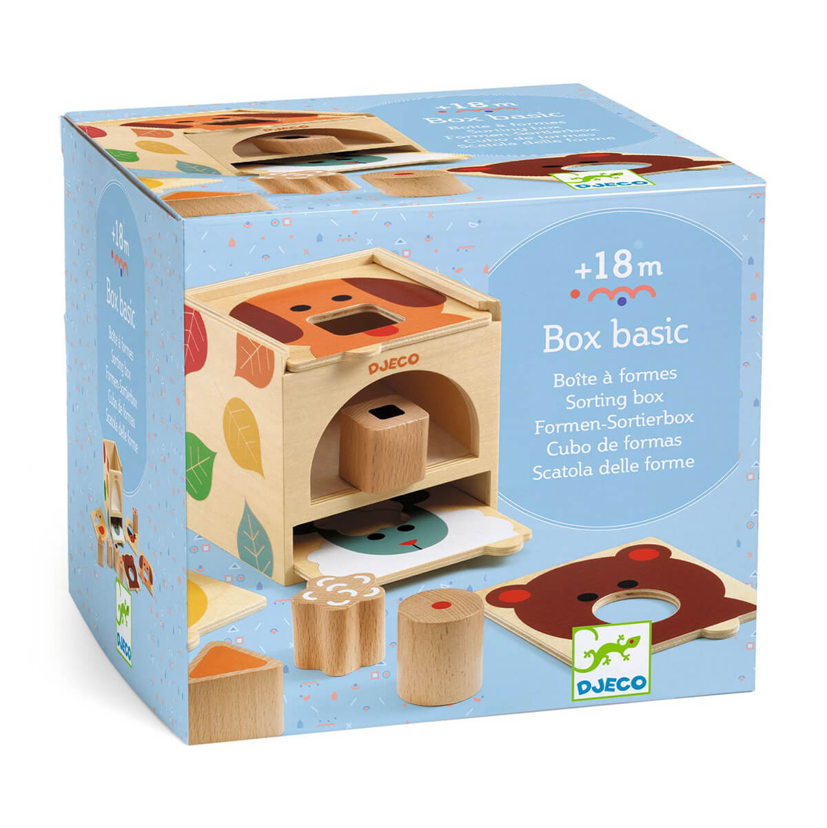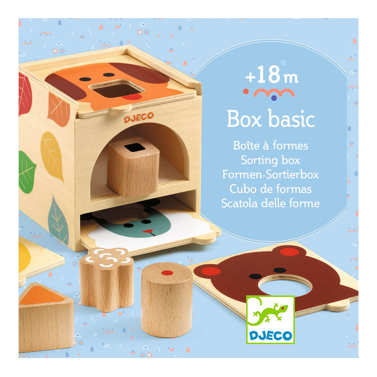 BoxBasic Shape Sorter by Djeco. BoxBasic is a unique shape sorter for children ages 18 months and up. Parents choose an animal and slide the shape into the box. Children then play at inserting one of the five shapes.