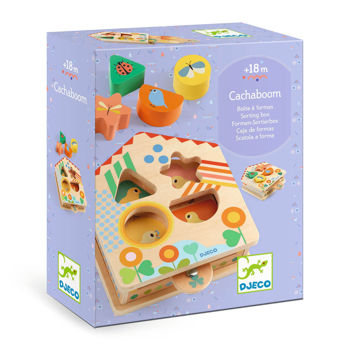 Cachaboom Shape Sorter by Djeco. An innovative wooden shape box that represents a house, designed for children aged 18 months and over. Children slide the four geometric pieces into the corresponding holes. They pull the tab and are surprised to see the pieces suddenly disappear. When they push the tab, the pieces reappear outside the box to start all over again.