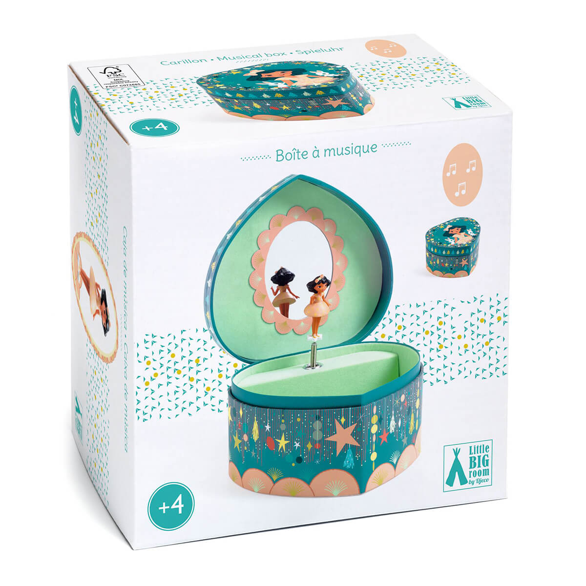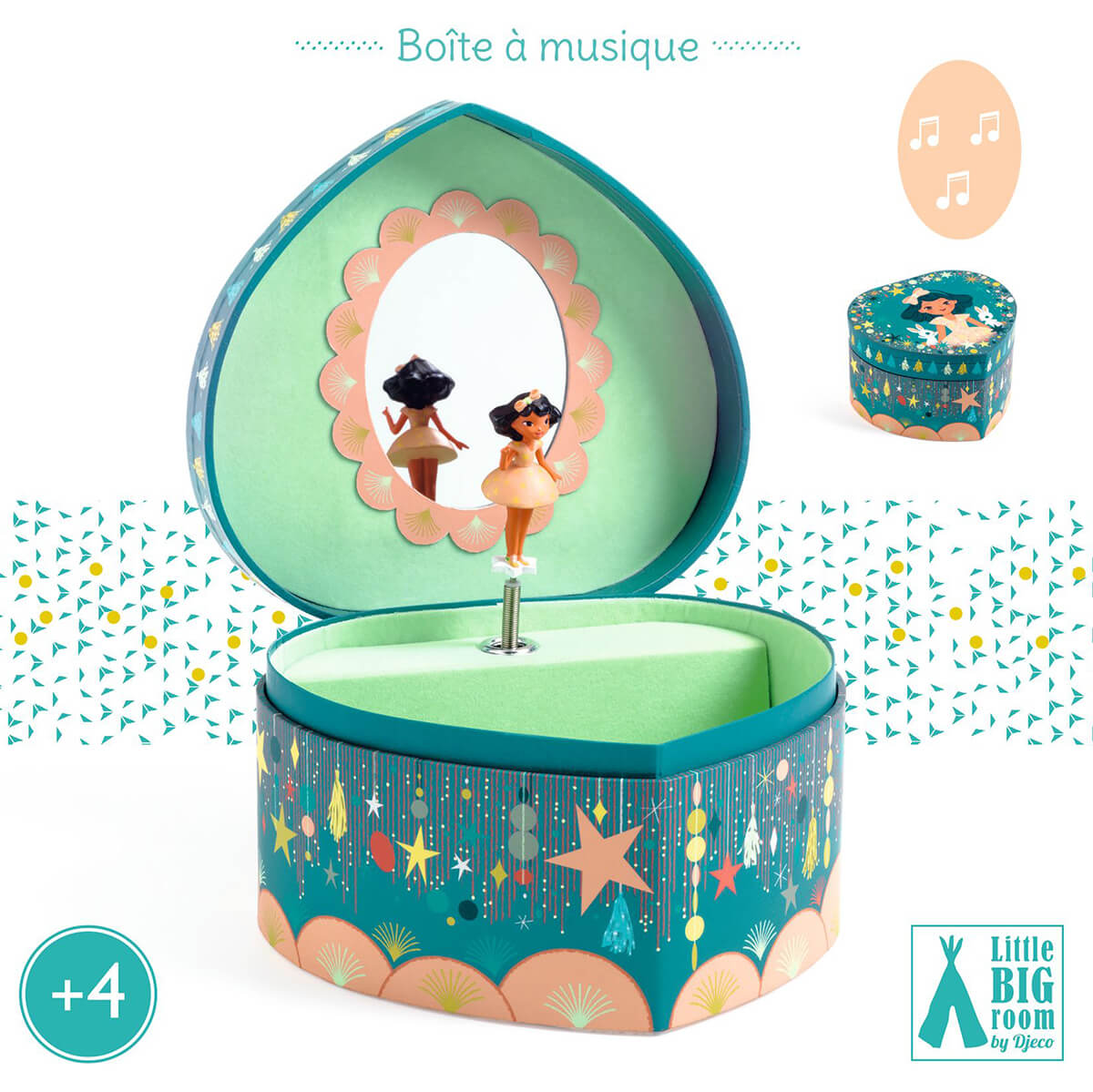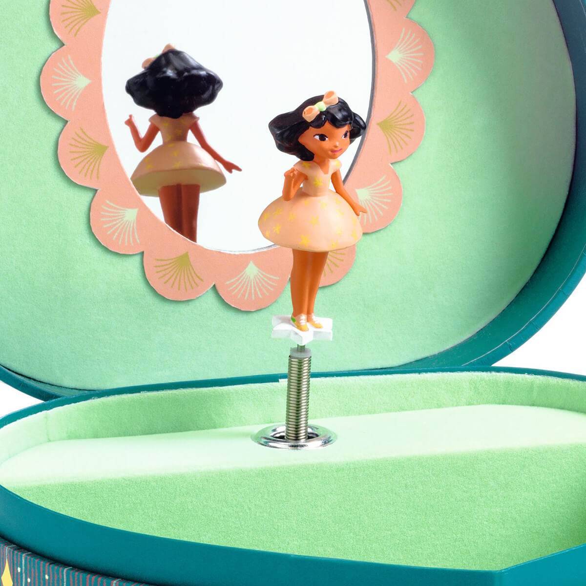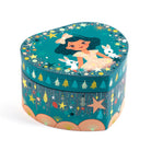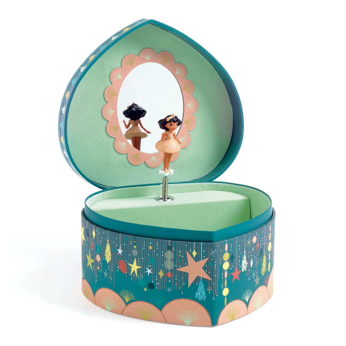 Happy Party Music Box by Djeco. Happy party is a beautifully illustrated heart-shaped music box to store your jewellery and secrets. Turn the crank, open the box, and surprise! A finely sculpted dancer turns and casts her reflection in a shaped mirror to the sound of Johann Strauss's "Stories from the Vienna Forest".