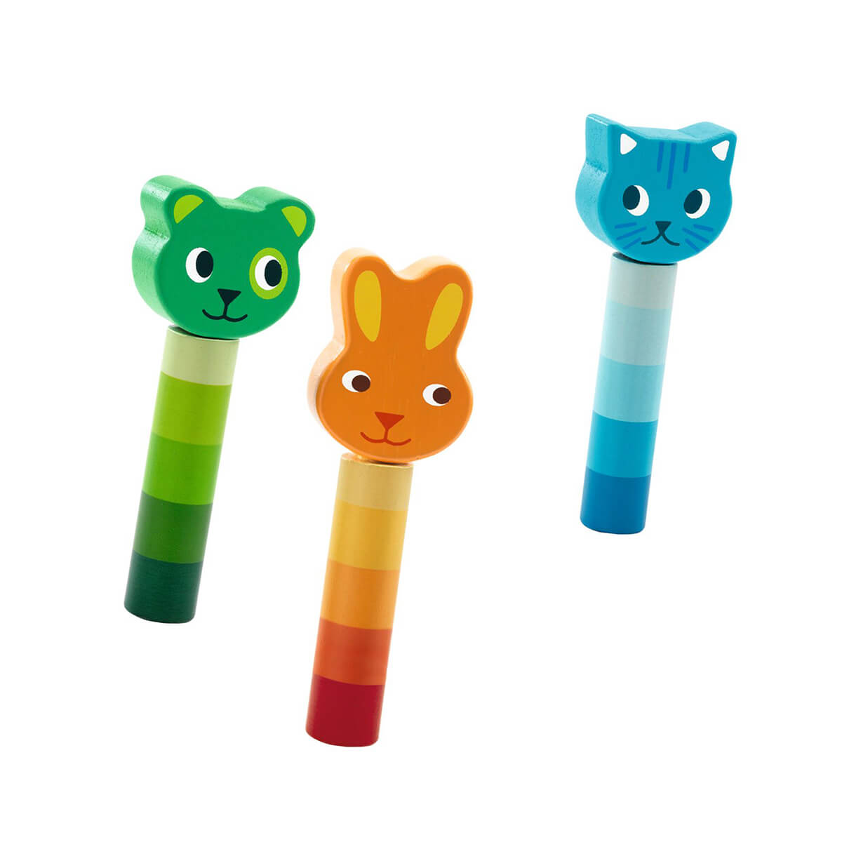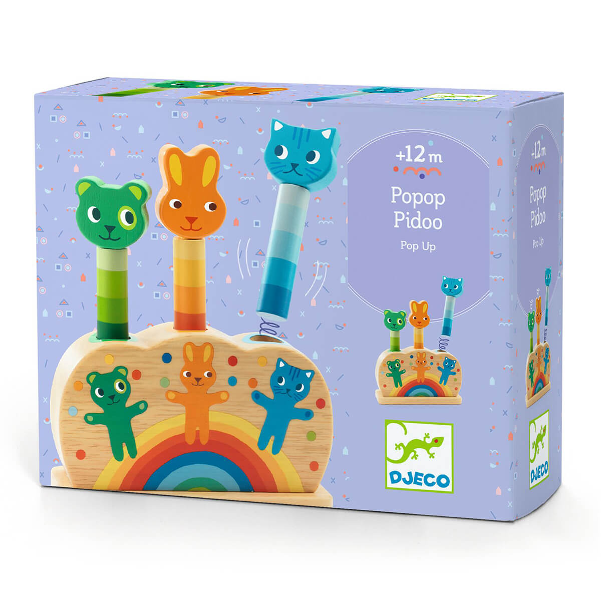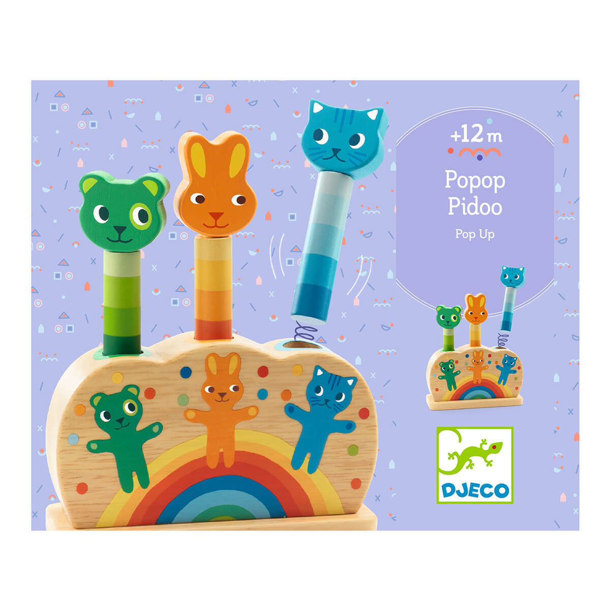 Popop Pidoo Wooden Toy by Djeco. A pop-up toy made of natural wood and brightly colored, designed for toddlers from 12 months. A beautifully illustrated base and three "animal" sticks to place in the holes to make them bounce.
