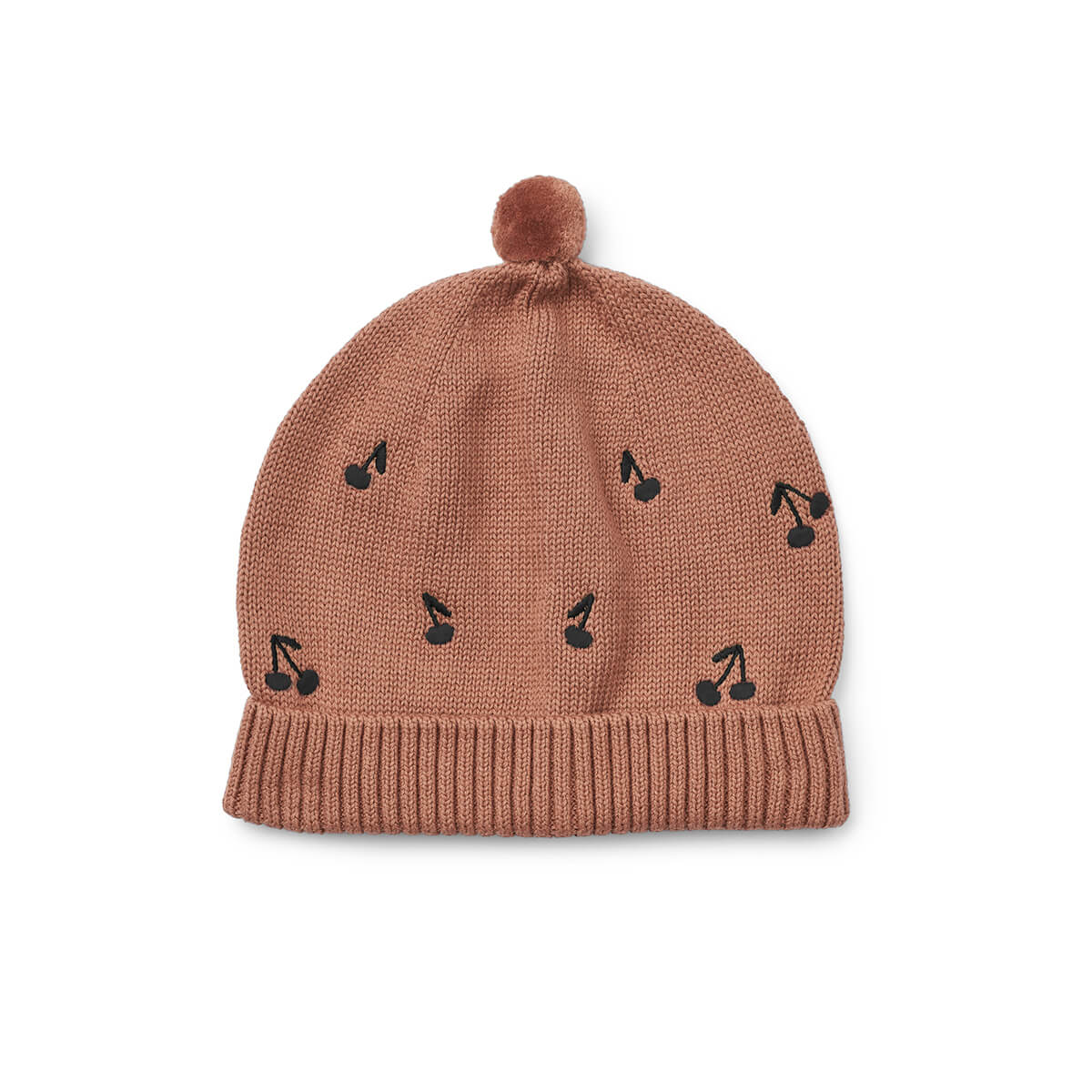 Aster beanie hat by Liewood. Knitted beanie with detailed all-over cherry embroidery.