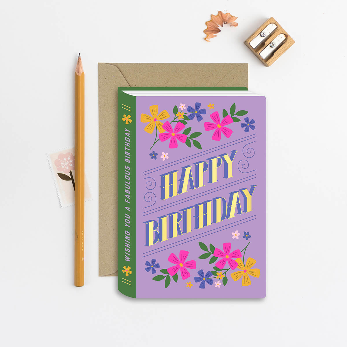 Birthday Book greetings card by Mifkins. Celebrate the big day with this unique book-shaped birthday card. The gold foil on the front cover of this storybook birthday card reads “Happy Birthday”, while the spine of the book offers a second caption reading “Wishing you a Fabulous Birthday”. Crack open this storybook birthday card and add your own tale of a birthday worth remembering. This birthday card is die cut into the shape of a book, and the gold foil details add a touch of luxury! Features an original design by Natalie Alex with beautiful gold foil embellishments. Blank inside.