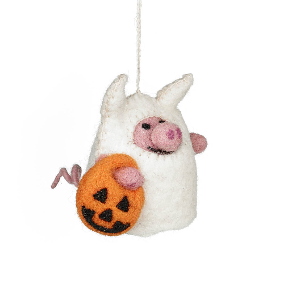 Boo Pig Ghost felted Halloween hanging decoration by Felt So Good. Hand needle felted Halloween decoration, featuring a pig in a Halloween ghost costume which has been carefully handstitched to her body and a little pumpkin bag ready for trick-or-treating.