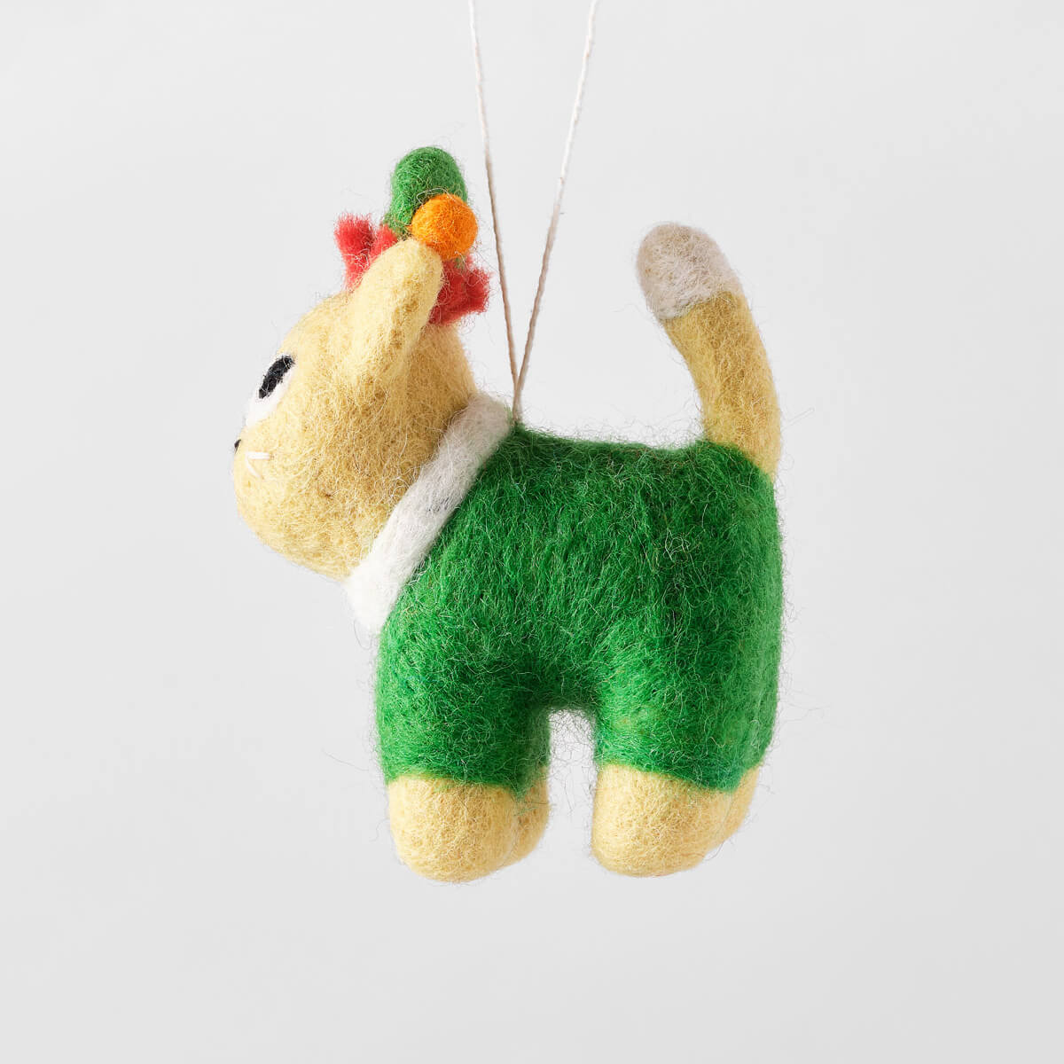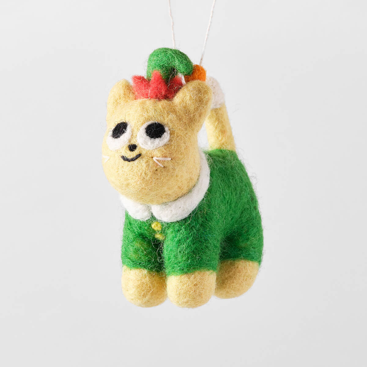 Buddy Cat In Elf Outfit Felt Decoration by Wrap. Hand needle felted hanging Christmas tree decoration. Buddy the cat is wearing a green elf outfit.