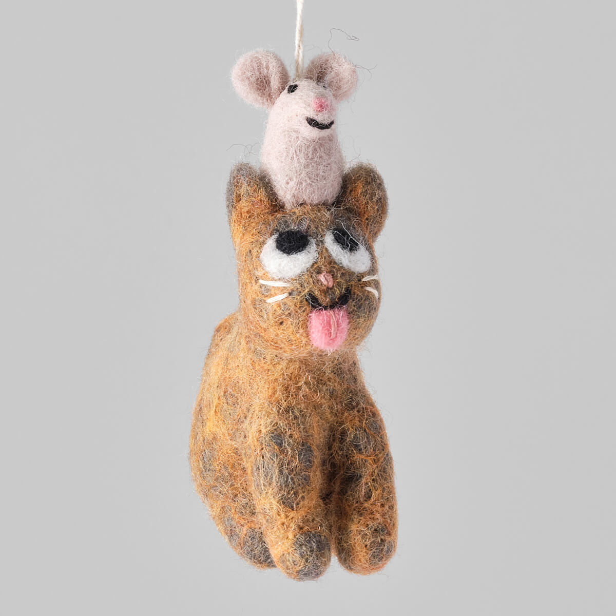 Clint Cat With Mouse Felt Decoration by Wrap. Hand needle felted hanging Christmas tree decoration. Clint the cat has a mouse sitting on his head.