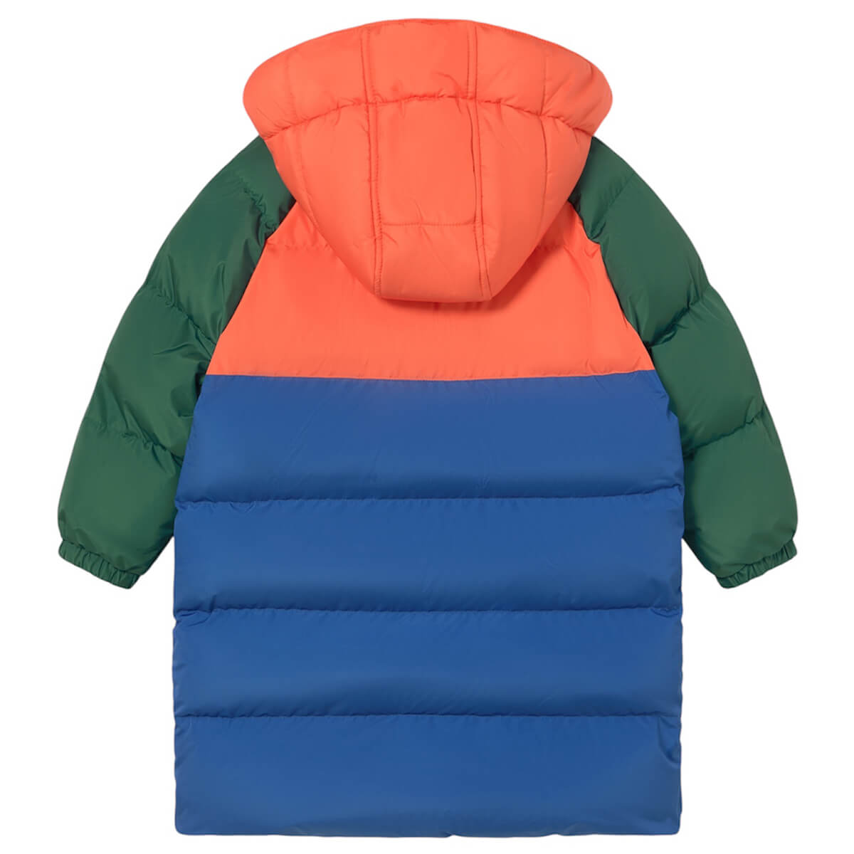 Colour Block Padded Jacket by Tinycottons. Stay cosy and stylish with this super warm colour block padded coat, crafted from 100% fluoride-free recycled polyester. It features a durable water resistance rating of 500-800pa, making it perfect for light rain and windy days. Designed for ultimate comfort, it includes a high neck with a full zip closure, a hood for extra protection, and a snap front placket for added coverage. The sherpa-lined pockets provide extra warmth and softness, ideal for chilly weather. Whether you’re running errands or heading outdoors, this jacket is your go-to choice for everyday wear.