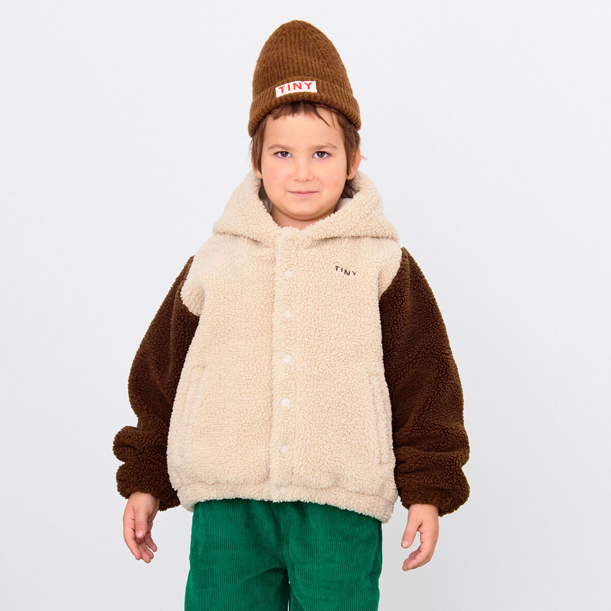Colour Block Padded Sherpa Hoodie by Tinycottons. This cool colour block polar sherpa hooded jacket is crafted from soft fabric to keep you cozy in cold weather. Featuring a snap closure, pockets, and a hood, its versatile design perfectly combines functionality, comfort, and a modern, cool look that stands out.