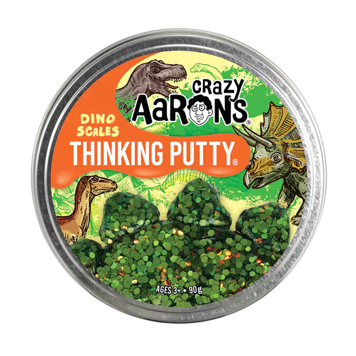 Dino Scales Trendsetters Thinking Putty by Crazy Aarons. Dinosaurs have crazy names. Did you know Brontosaurus means Thunder Lizard? How about Oviraptor? Thats the Egg Thief. Whats your dinosaur name? Stretch out your Dino Scales and introduce yourself. This green putty includes shimmering green scales. Stretchable and sculptable with a soft texture.