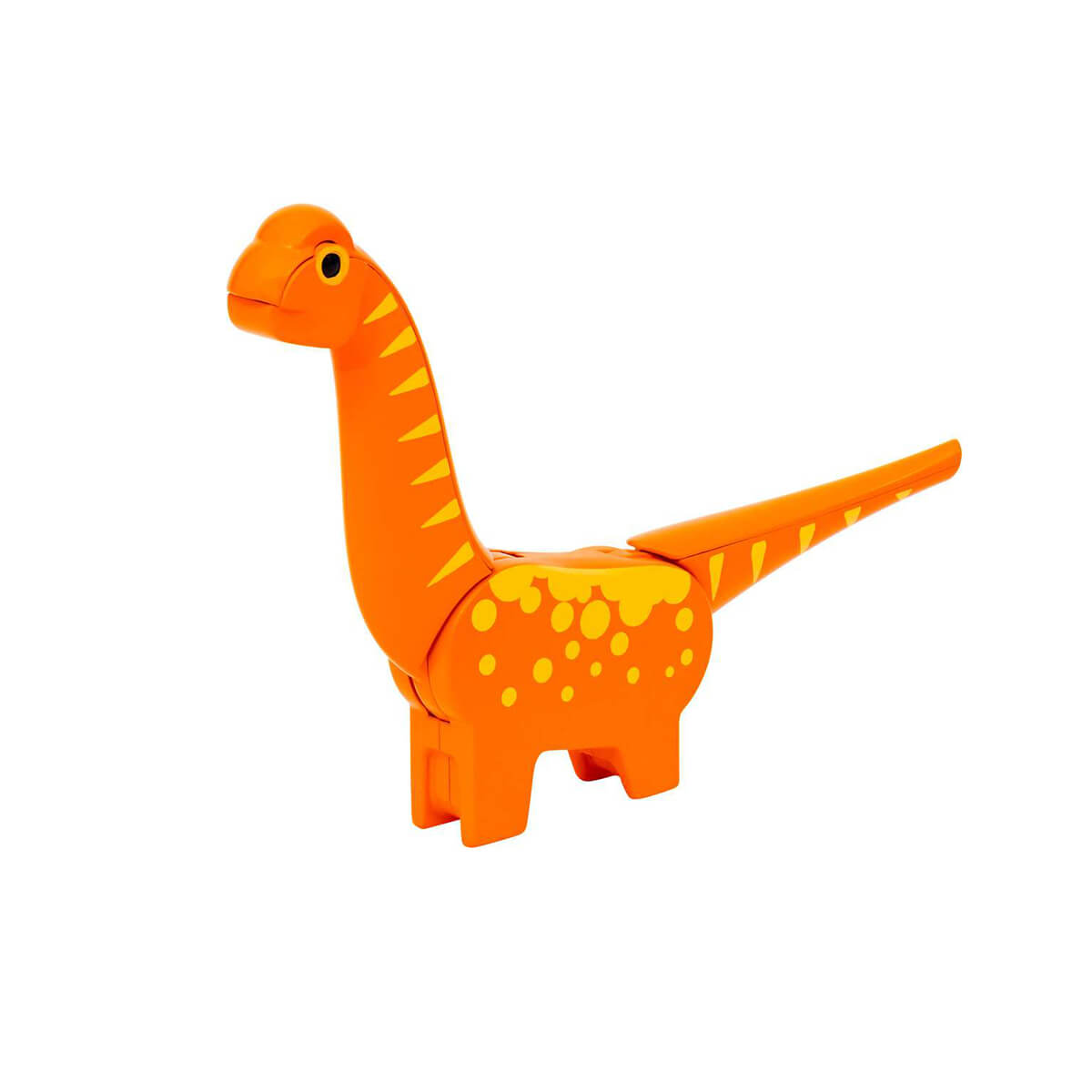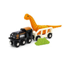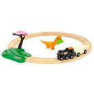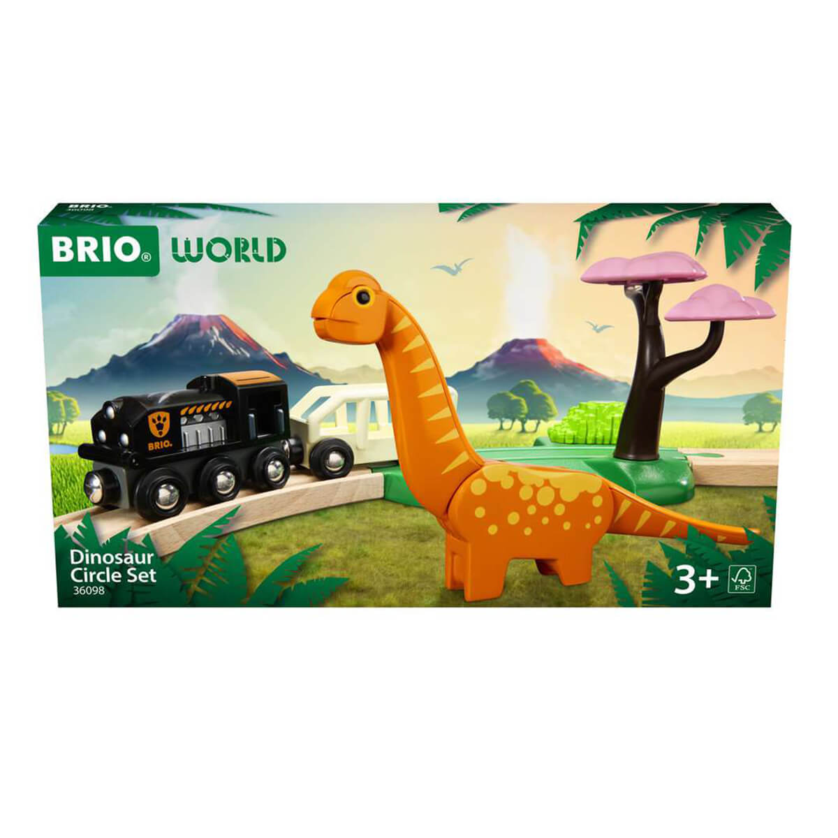 Dinosaur Circle set by Brio. Roar! There’s a dinosaur on the track in the Dinosaur Circle Set. This 12-piece dinosaur-themed train set includes a train with wagon, dinosaur figure, grassy meadow crossing and wooden tracks to complete the circle layout. Be careful as the train approaches the crossing as this colourful dinosaur loves to eat the leaves from the tree. Use its tail to raise and lower the dinosaurs head, then grab accessories with the classic BRIO magnet.