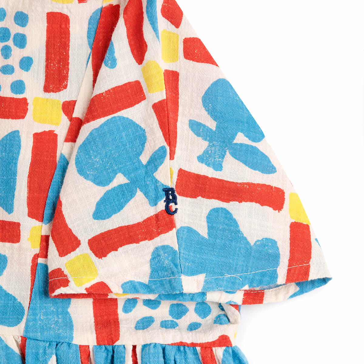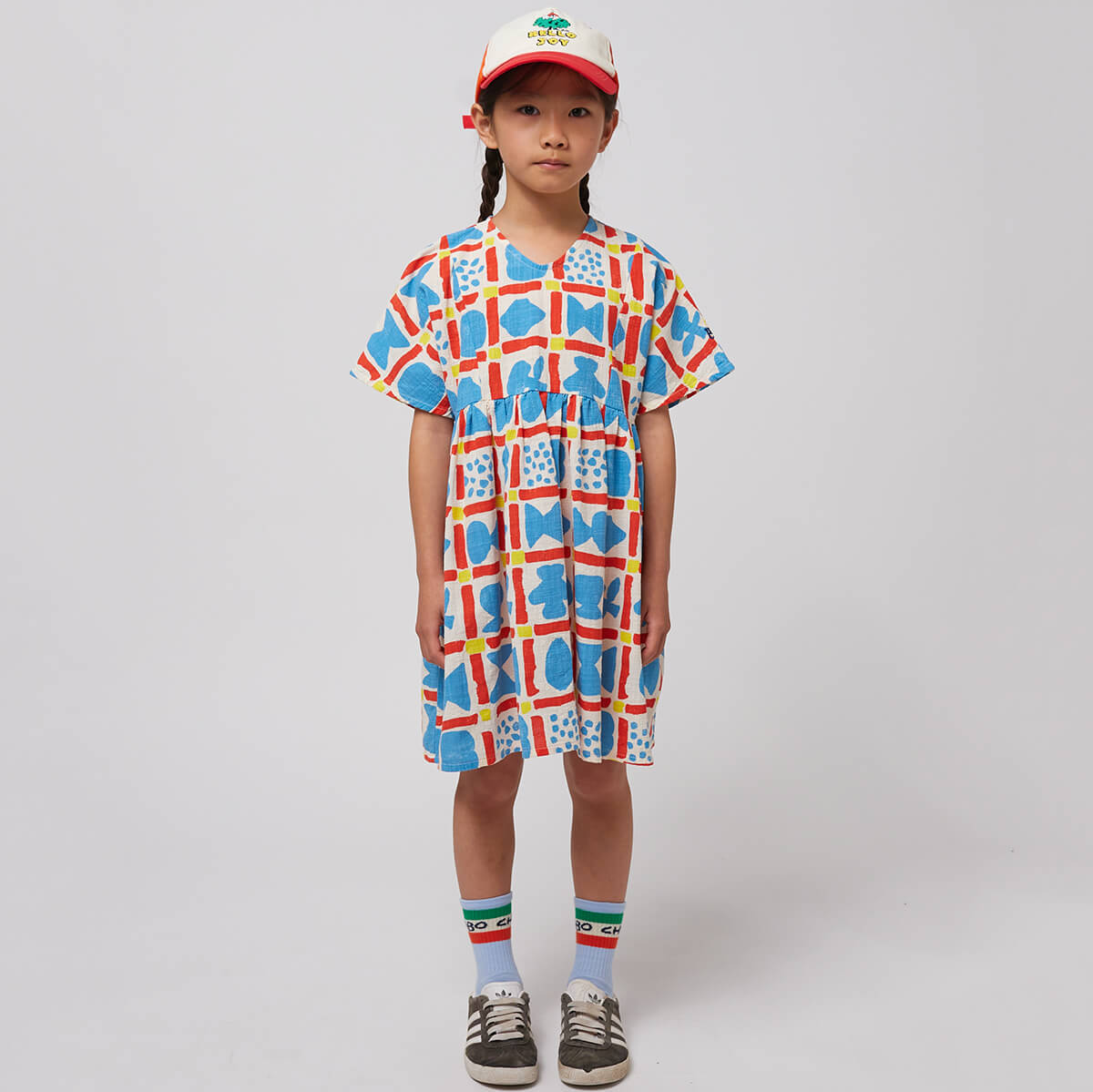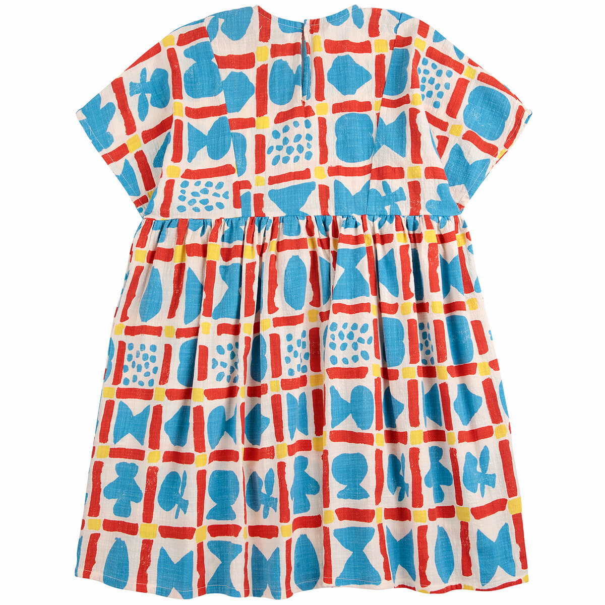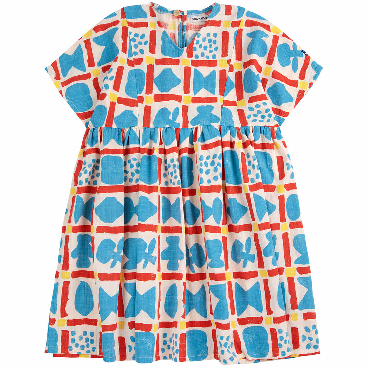 Geometric Game All Over Woven Dress by Bobo Choses. Understated and refined, this offwhite dress is a versatile essential. Made from 100% organic cotton, it features a v-neck, short sleeves, and back button fastening. Gathering details, embroidery, and an evasé fit add timeless charm to its loose, short silhouette. Thoughtfully crafted in Spain.