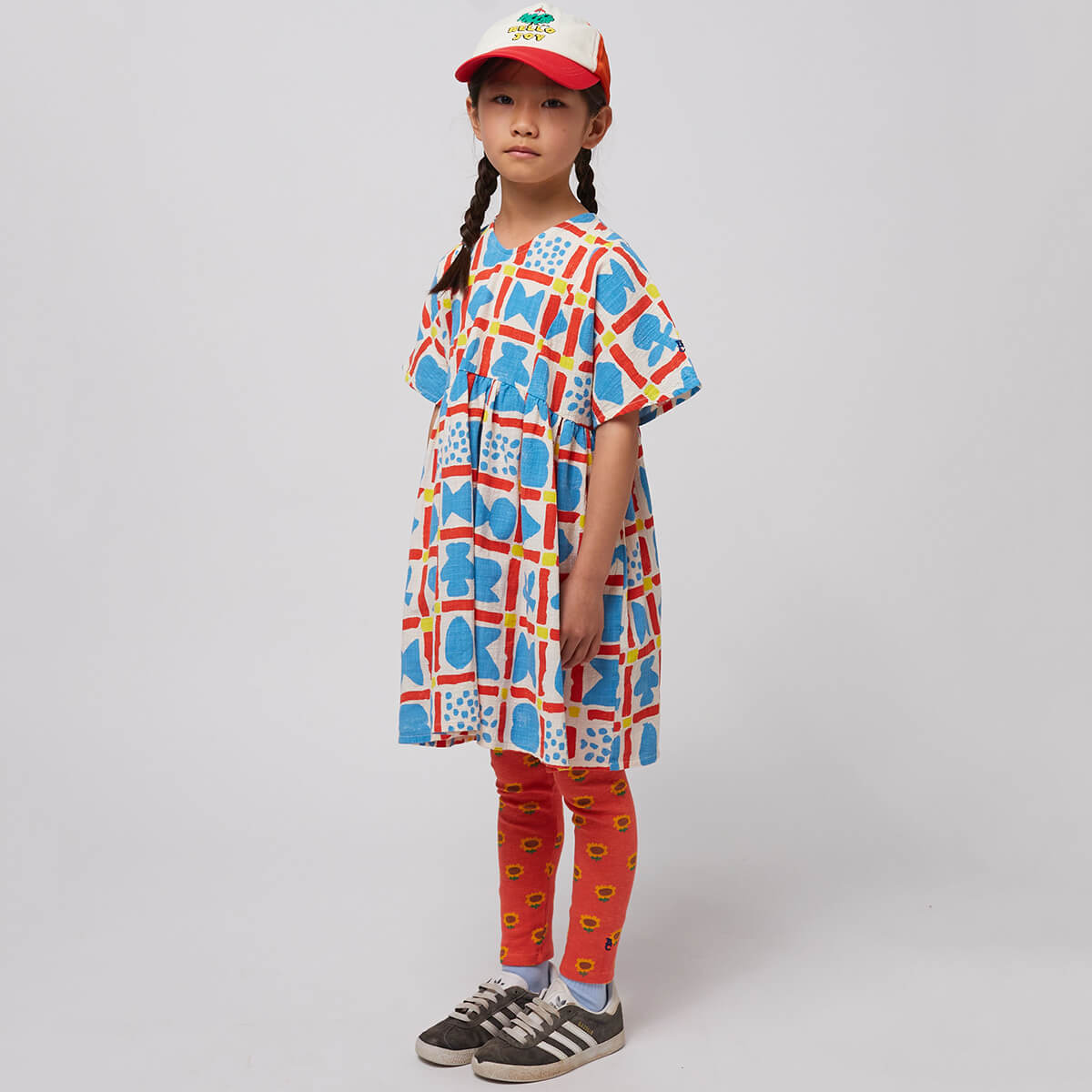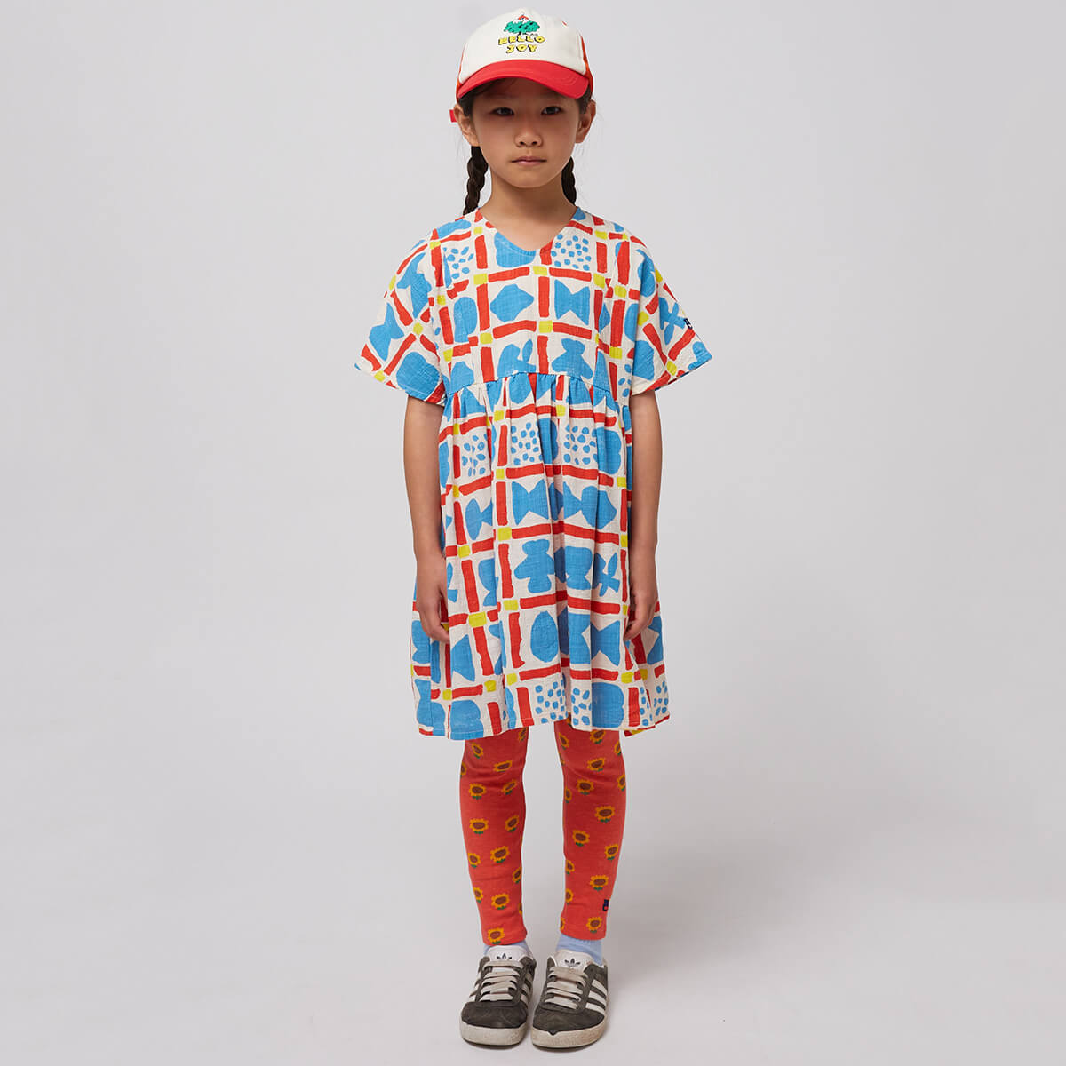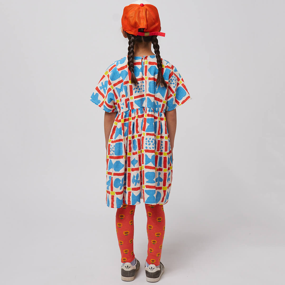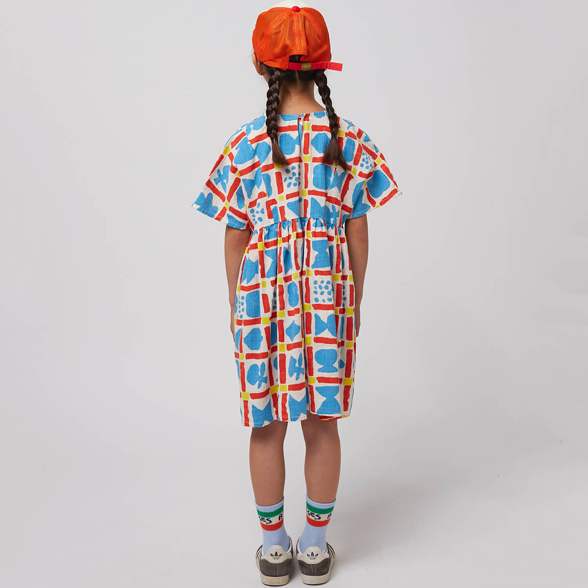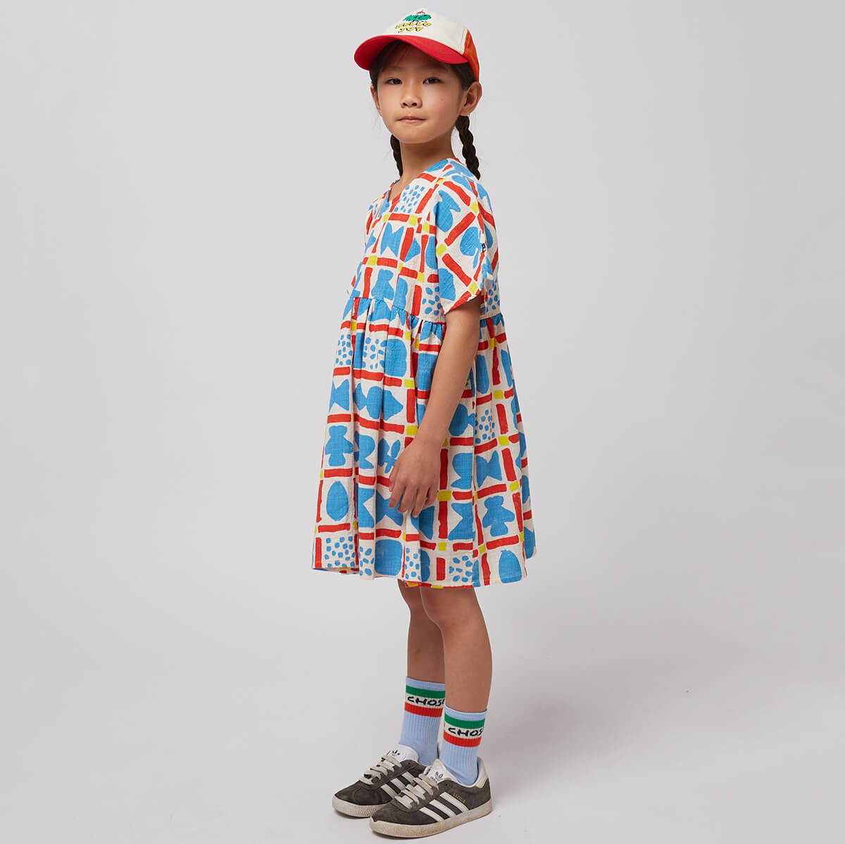 Geometric Game All Over Woven Dress by Bobo Choses. Understated and refined, this offwhite dress is a versatile essential. Made from 100% organic cotton, it features a v-neck, short sleeves, and back button fastening. Gathering details, embroidery, and an evasé fit add timeless charm to its loose, short silhouette. Thoughtfully crafted in Spain.