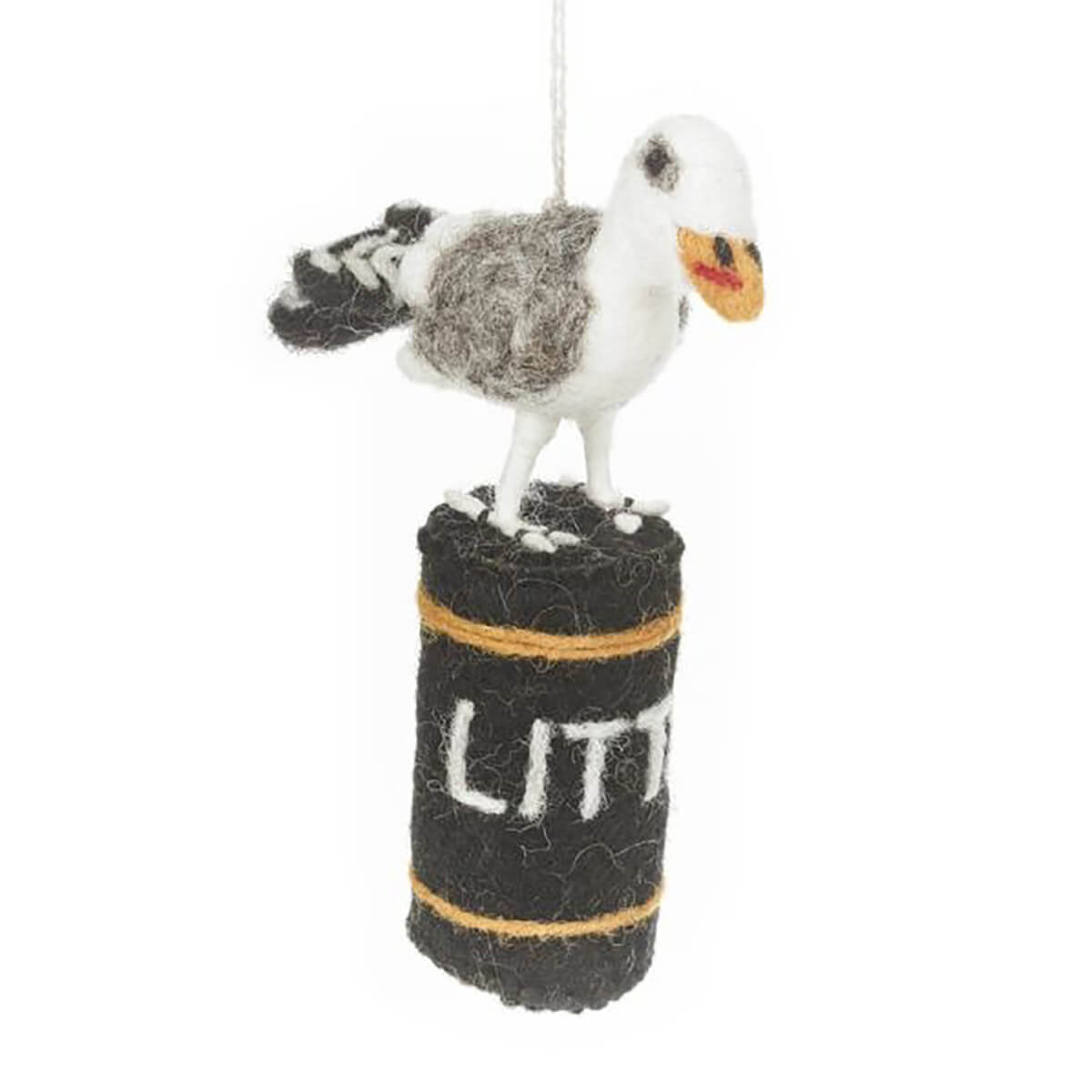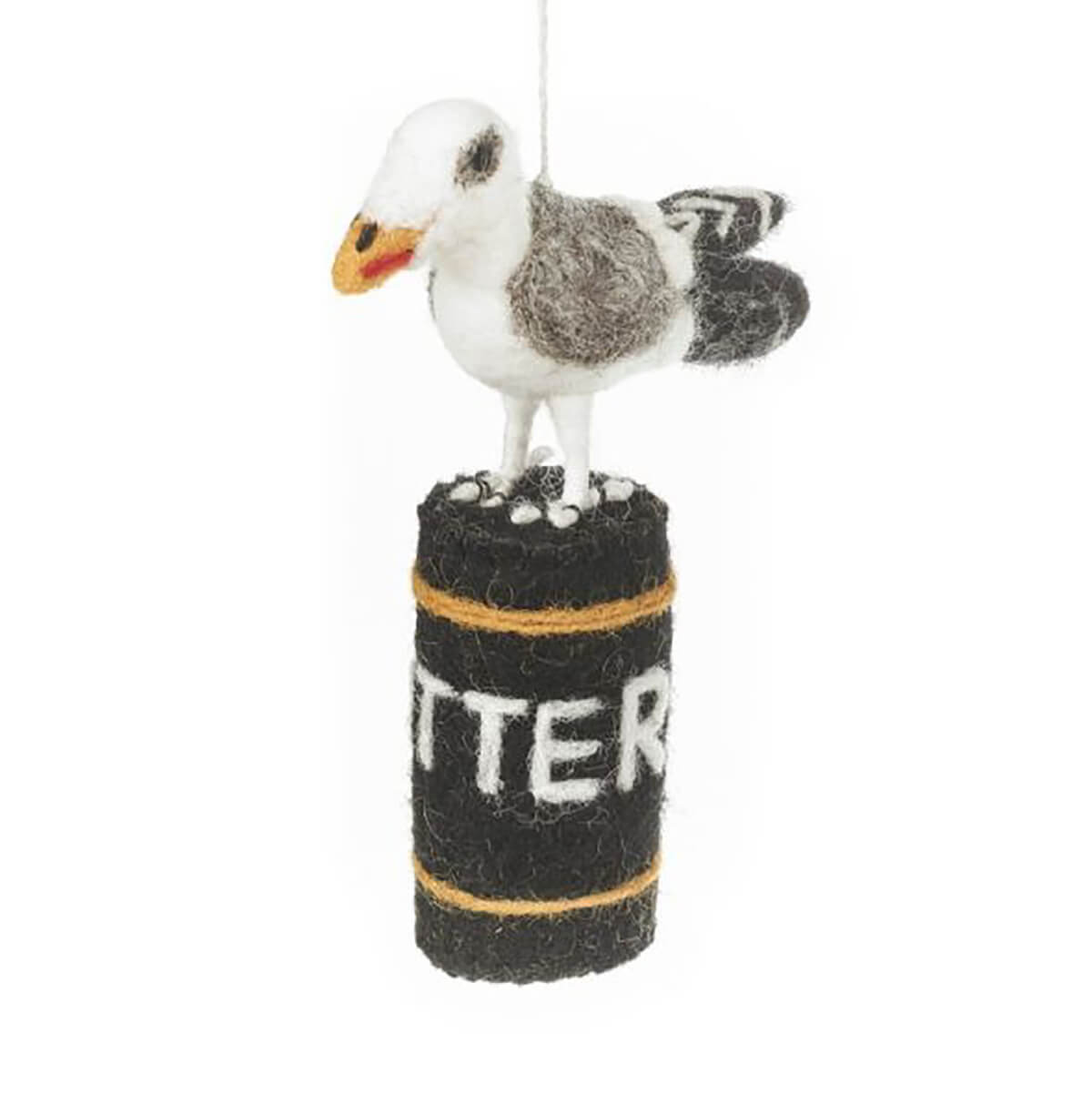 Hangry Seagull hanging decoration by Felt So Good. Welcome to the British seaside! We've all had a run-in with this belligerent bird in our time. This Hangry Seagull has just finished rummaging through the bins, and he's now set his eyes on your ice cream - watch out! Handmade using natural, biodegradable materials using needle felting techniques.