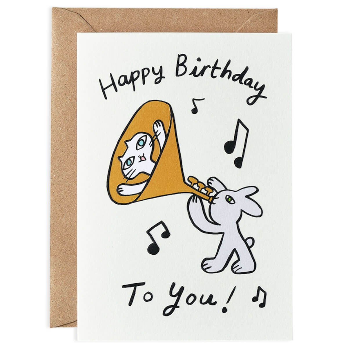 Happy Birthday Cat Trumpet Embossed Greetings Card by Molly Fairhurst for Wrap. This cat has a concerto just for you with this fun birthday card from illustrator Molly Fairhurst. Blank inside with a speckled brown envelope.