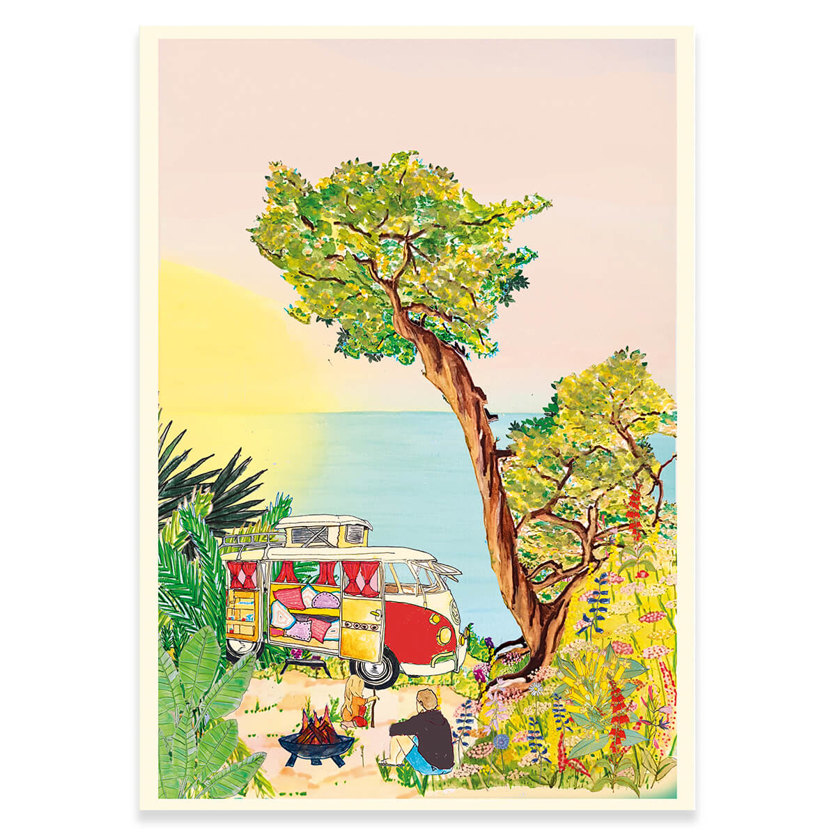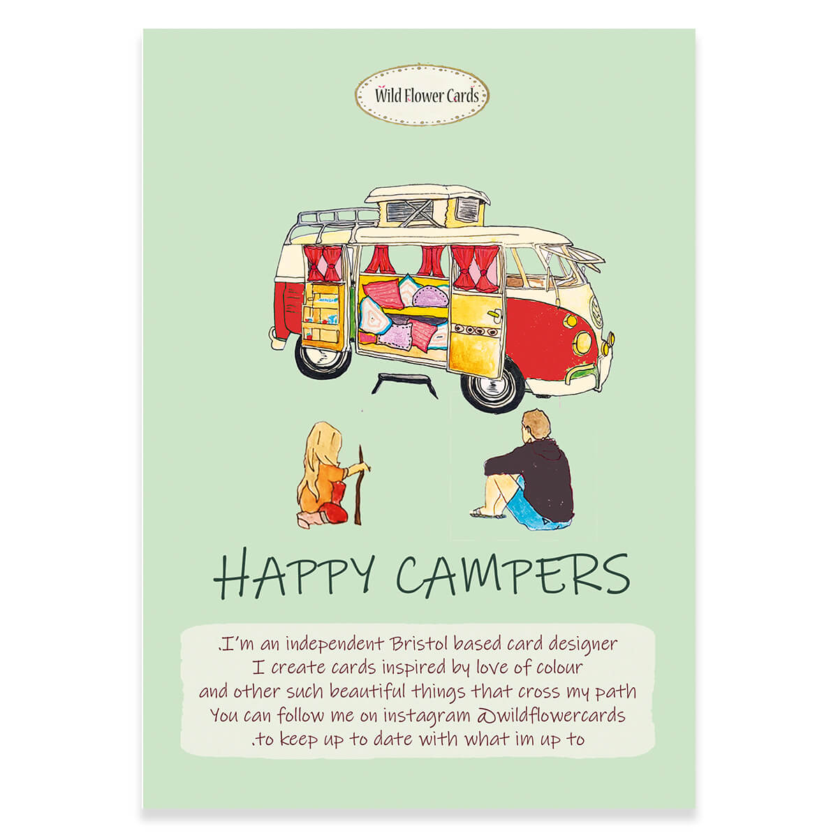 Happy Camper greetings card by Wildflower Cards. Features an illustration by Grainne Thompson on both the front and back of the card. Blank inside with cream envelope.