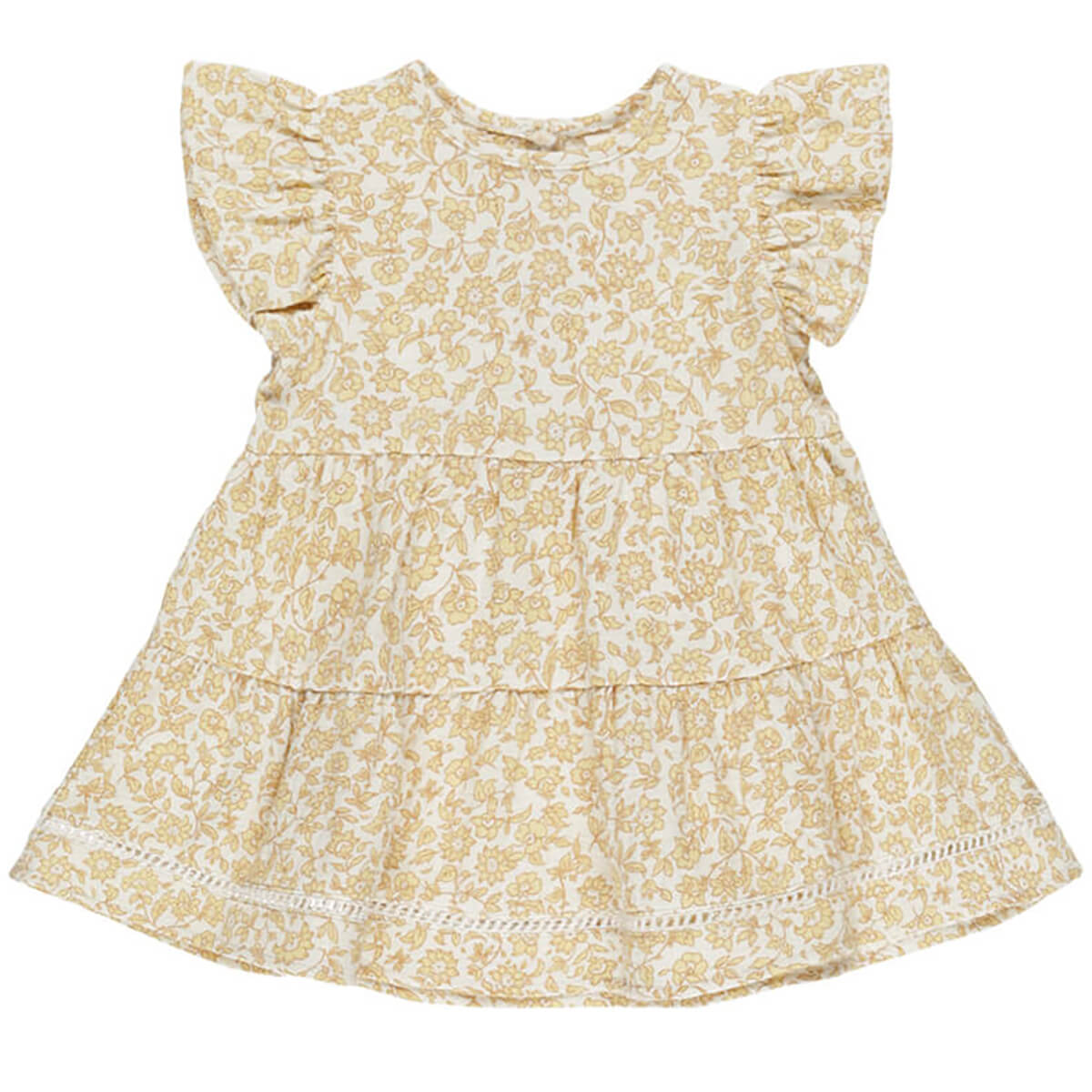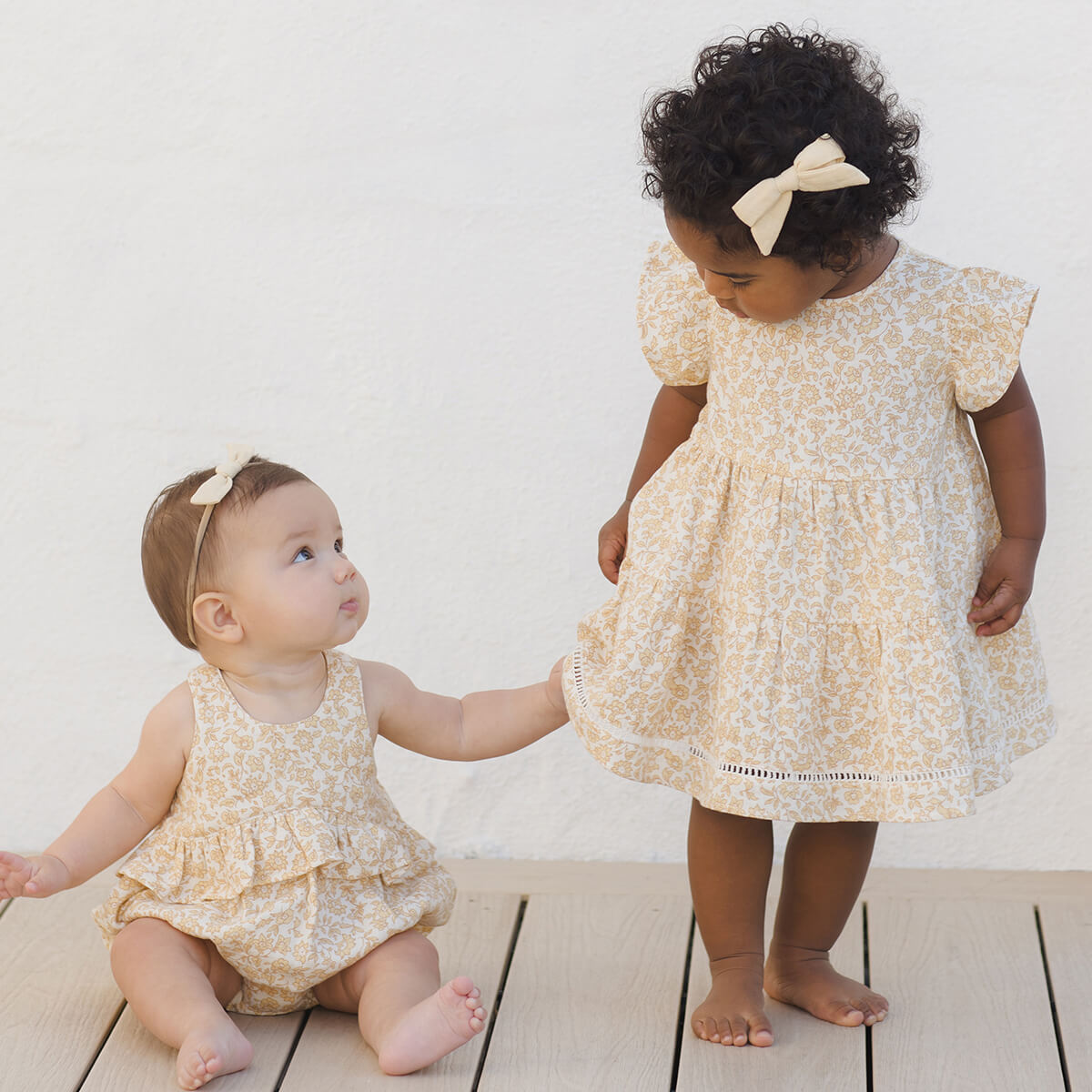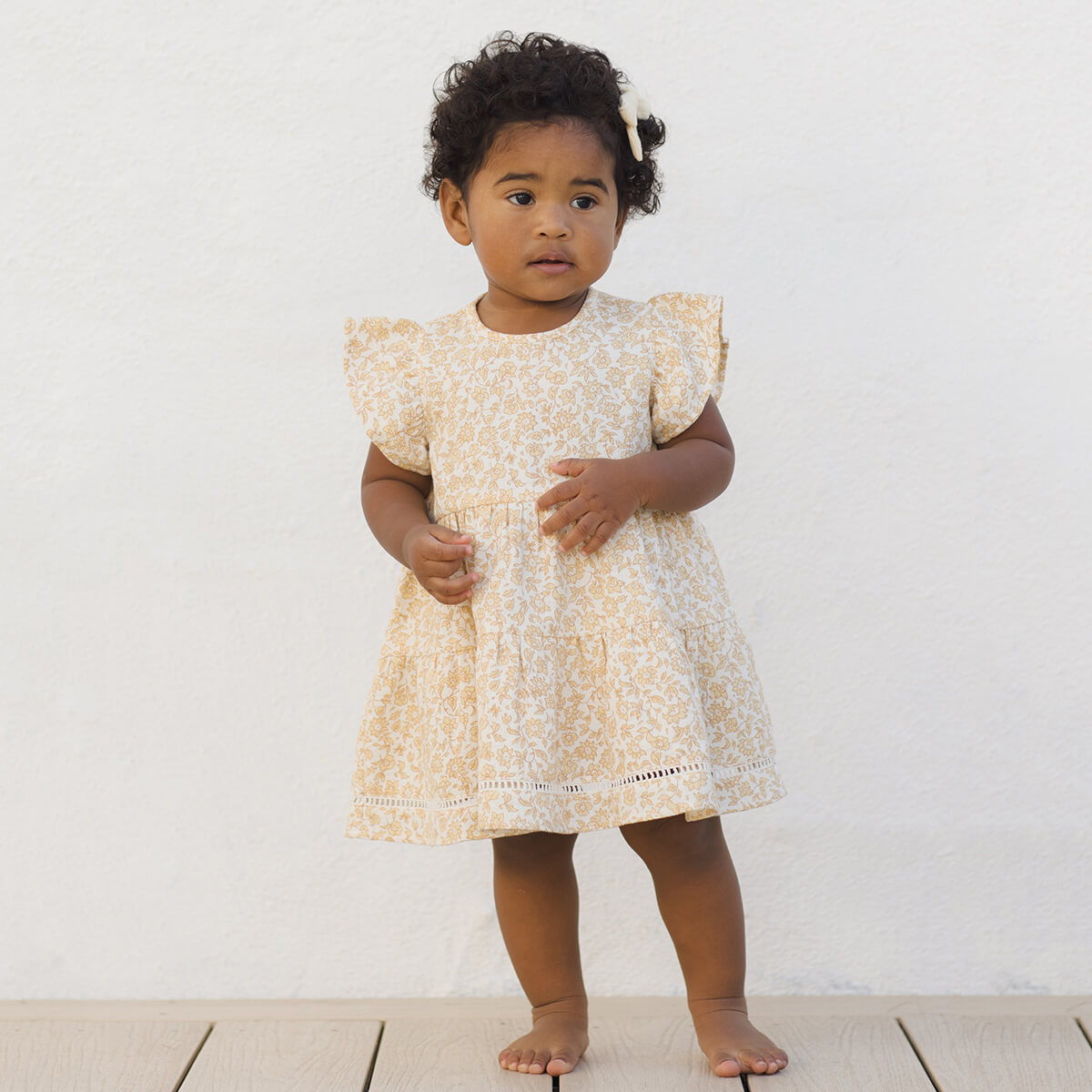 Lily Dress by Quincy Mae. Flutter sleeves, eyelet detail and a full skirt make up this lovely dress. Designed with a button back closure for easy wear. Coordinating bloomers included with all sizes.