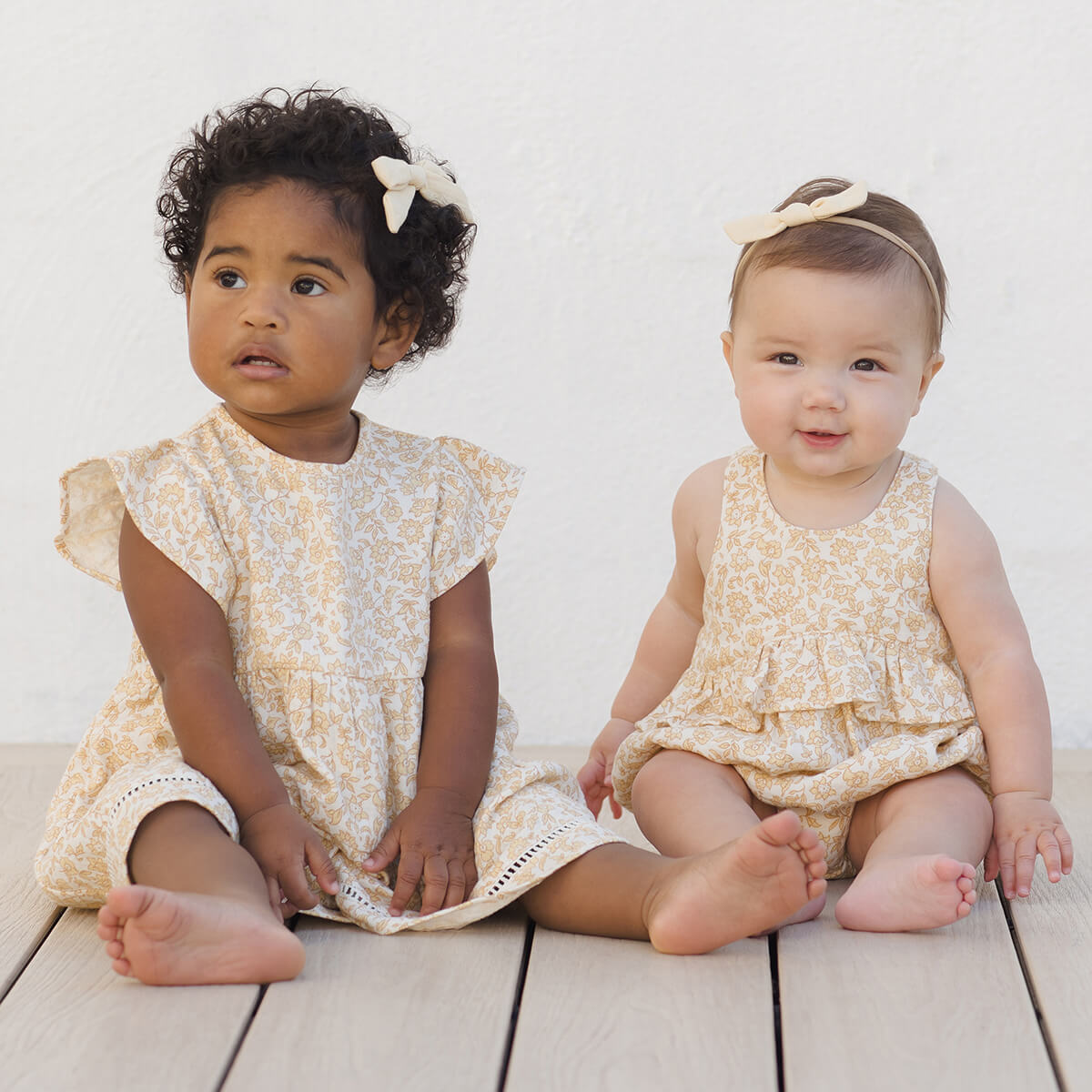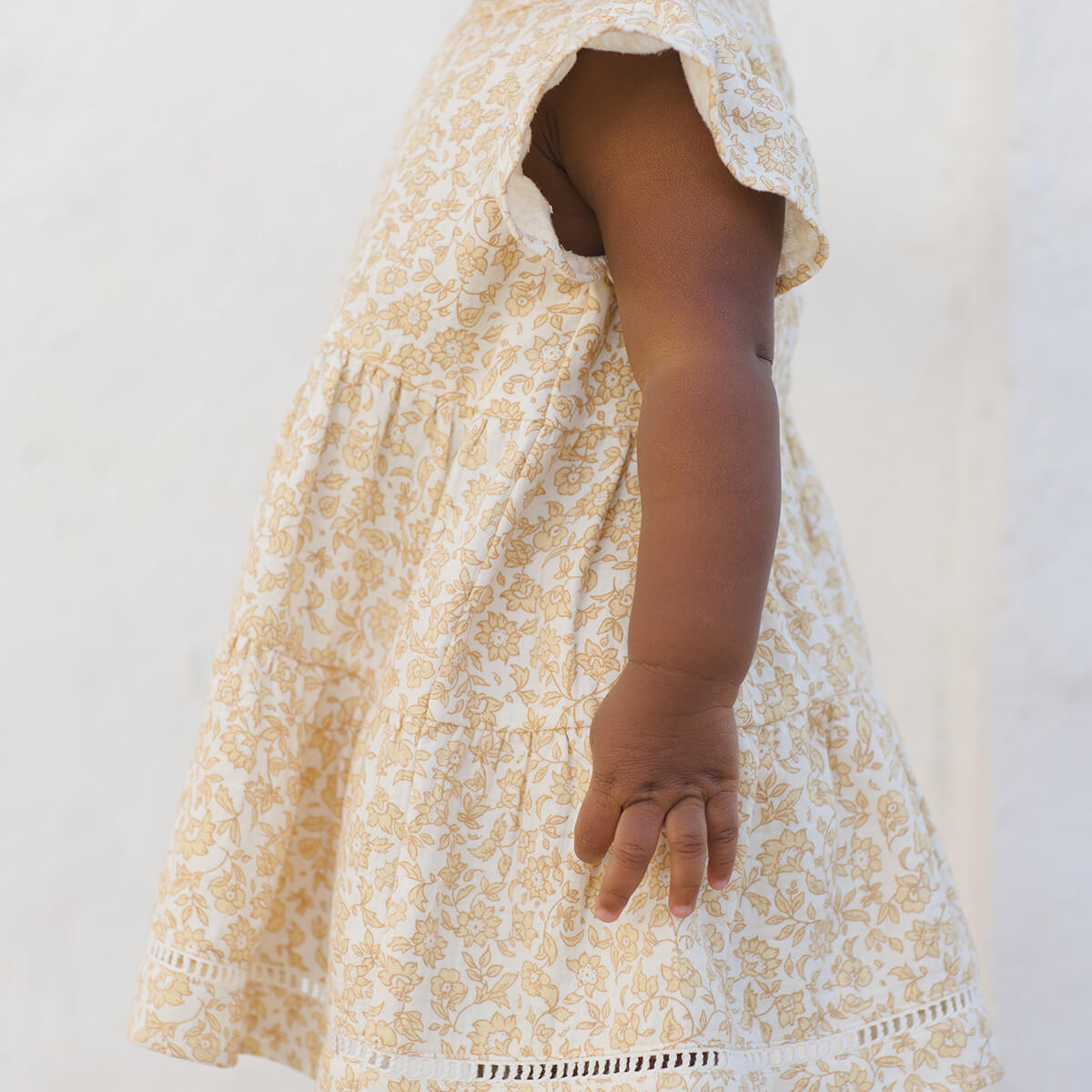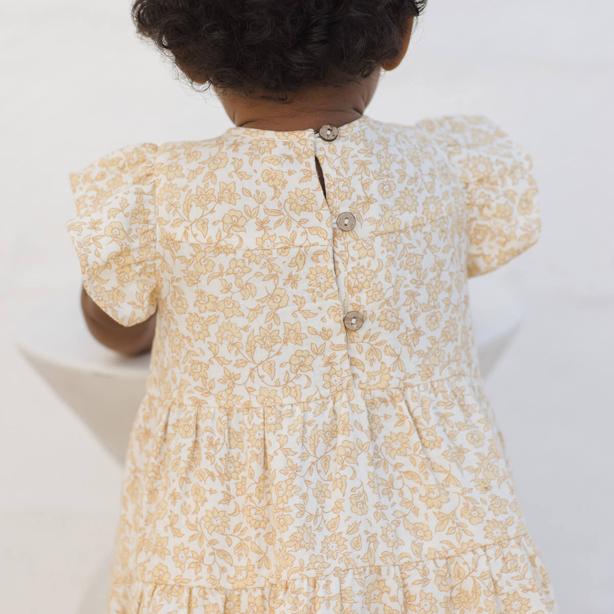 Lily Dress by Quincy Mae. Flutter sleeves, eyelet detail and a full skirt make up this lovely dress. Designed with a button back closure for easy wear. Coordinating bloomers included with all sizes.