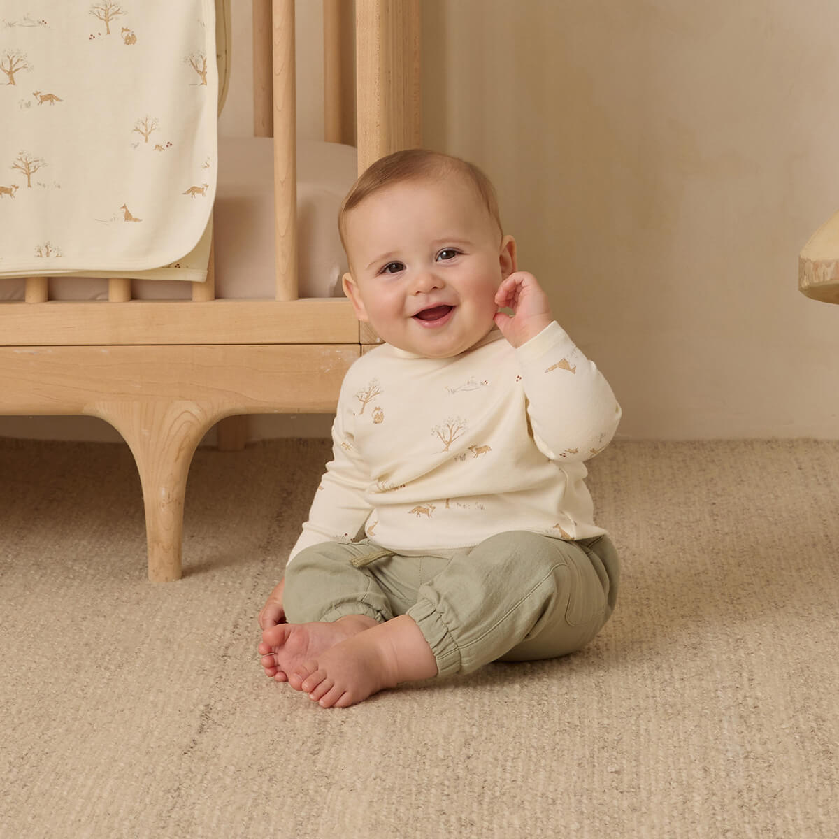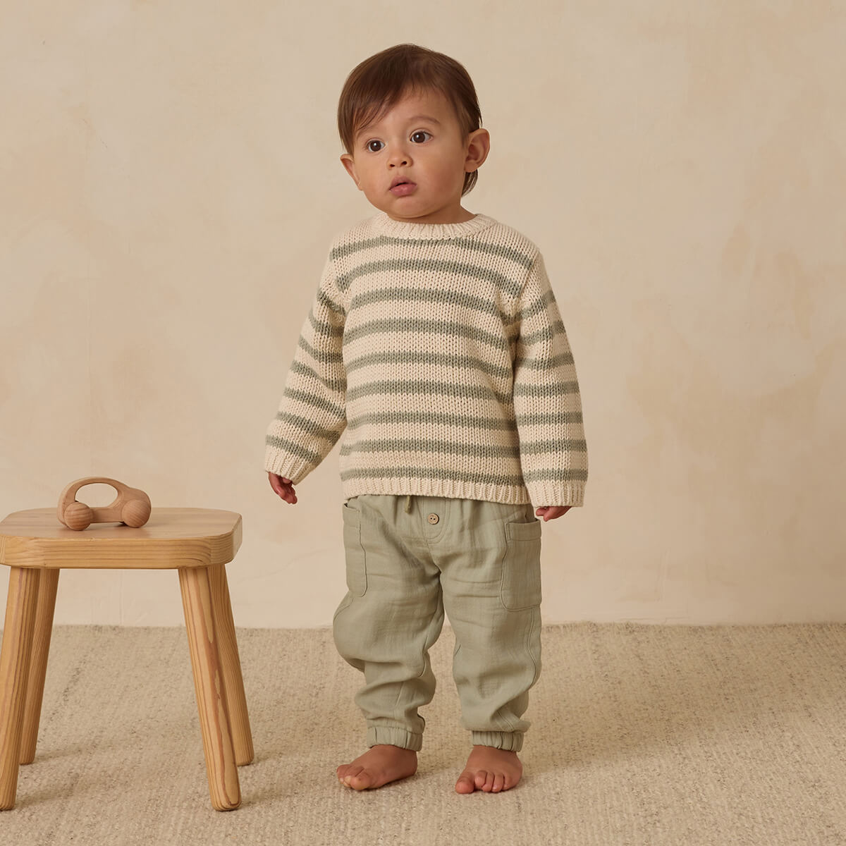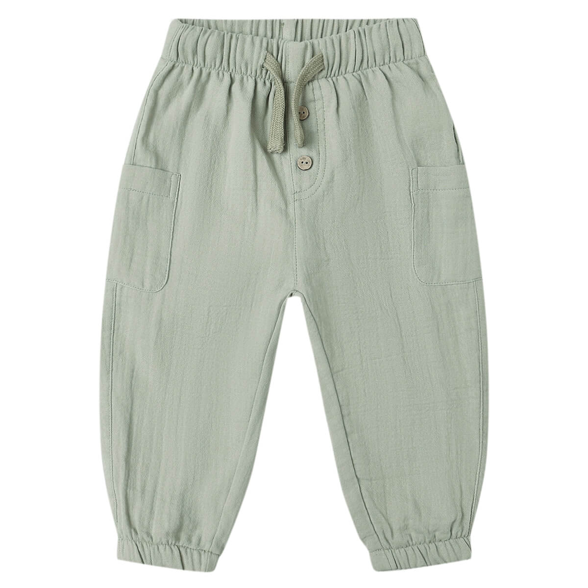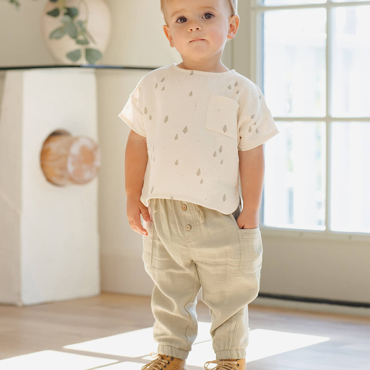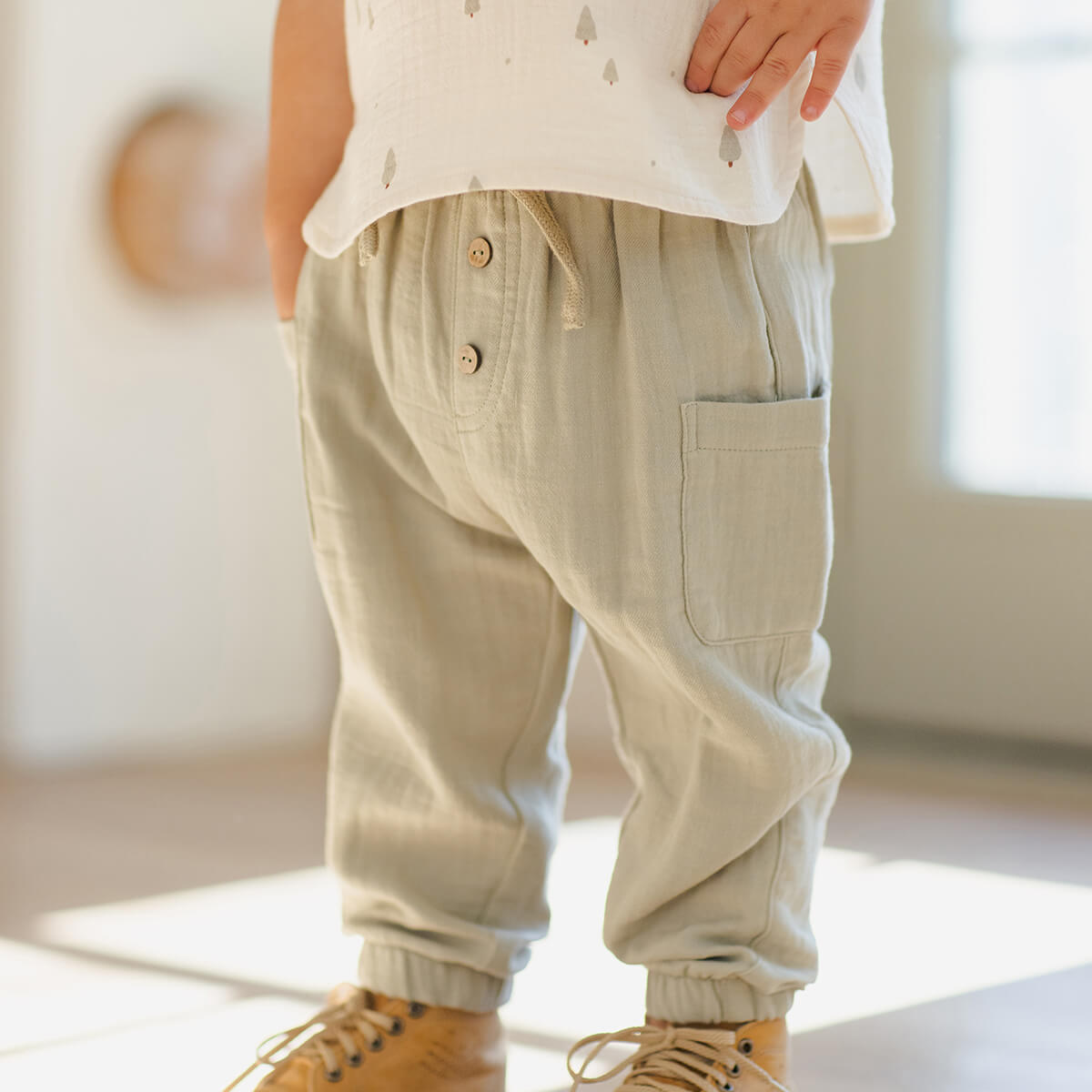 Luca Pants by Quincy Mae. Comfortable woven pants with an elastic waistband and leg openings, adjustable drawstring, and side patch pockets.