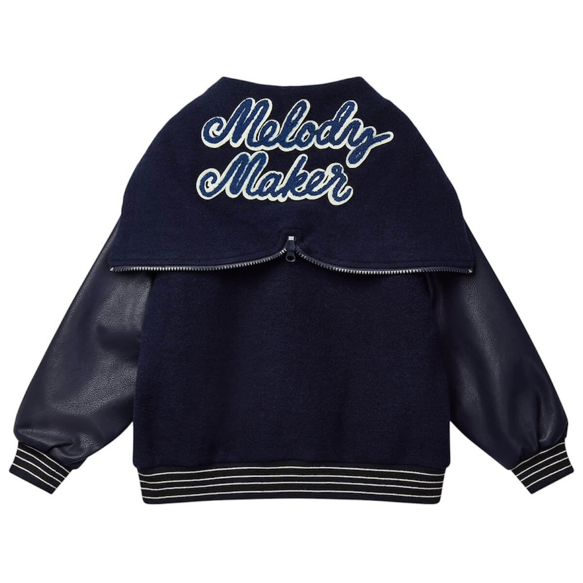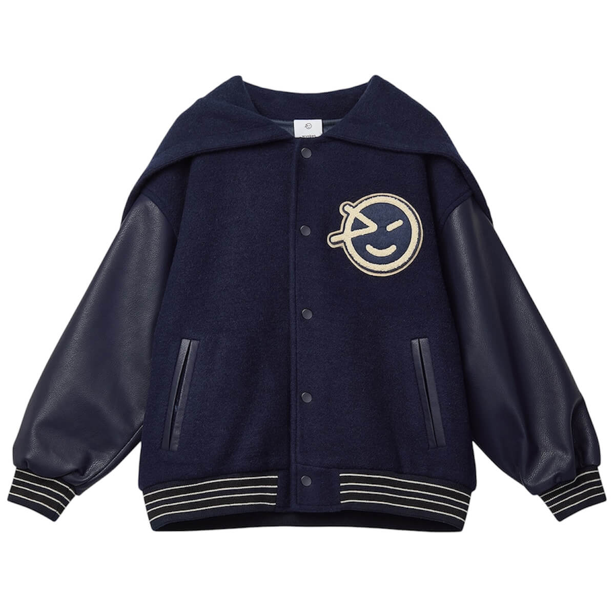 Mako Hooded Bomber by Wynken. A standout layer for cooler days, this varsity jacket brings a clever twist with its transformable hood—wear it zipped for a cosy fit or unzipped as a laid-back oversized collar. Crafted with soft faux leather sleeves and a wool-blend body, it’s all about warmth and comfort without compromising on style. Finished with the signature Wynken badge, it’s made for everyday adventures with just the right edge.