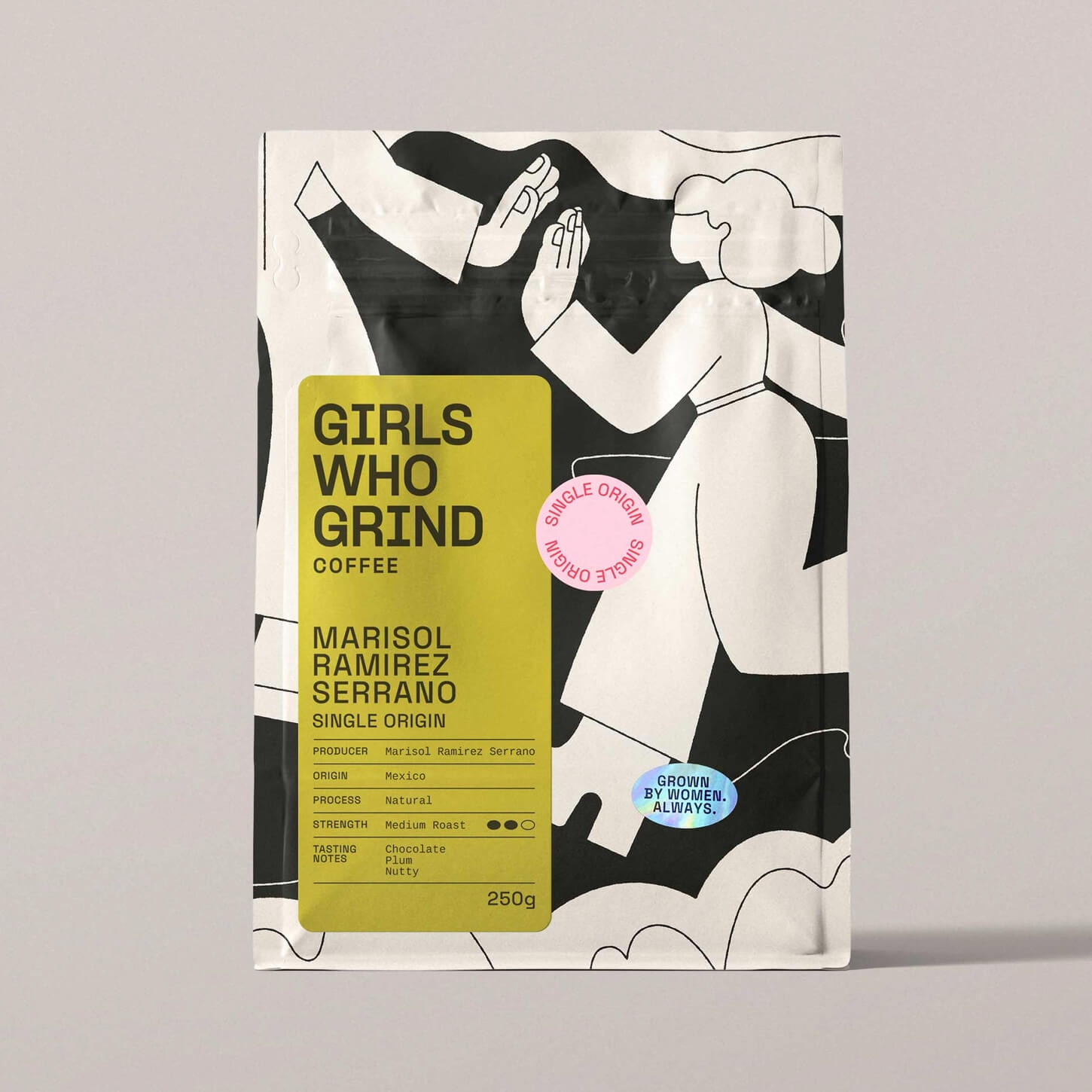 Marisol Ramirez Serrano Paper Filter Coffee by Girls Who Grind Coffee. This beautiful coffee was produced by Marisol Ramirez Serrano. Mari manages her own farm, is a Q-Grader, and mother. She is constantly working to improve the quality of her coffee and the operations of her farm. She also has to work hard to balance work and family life, which we know all too well about at GWGC. If you want a sweet and nutty coffee with notes of chocolate, and plum, this is for you.