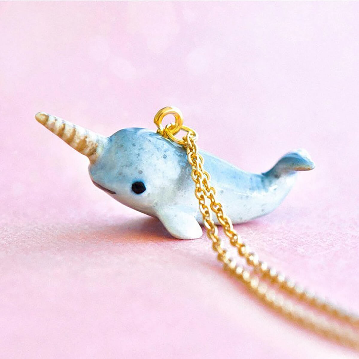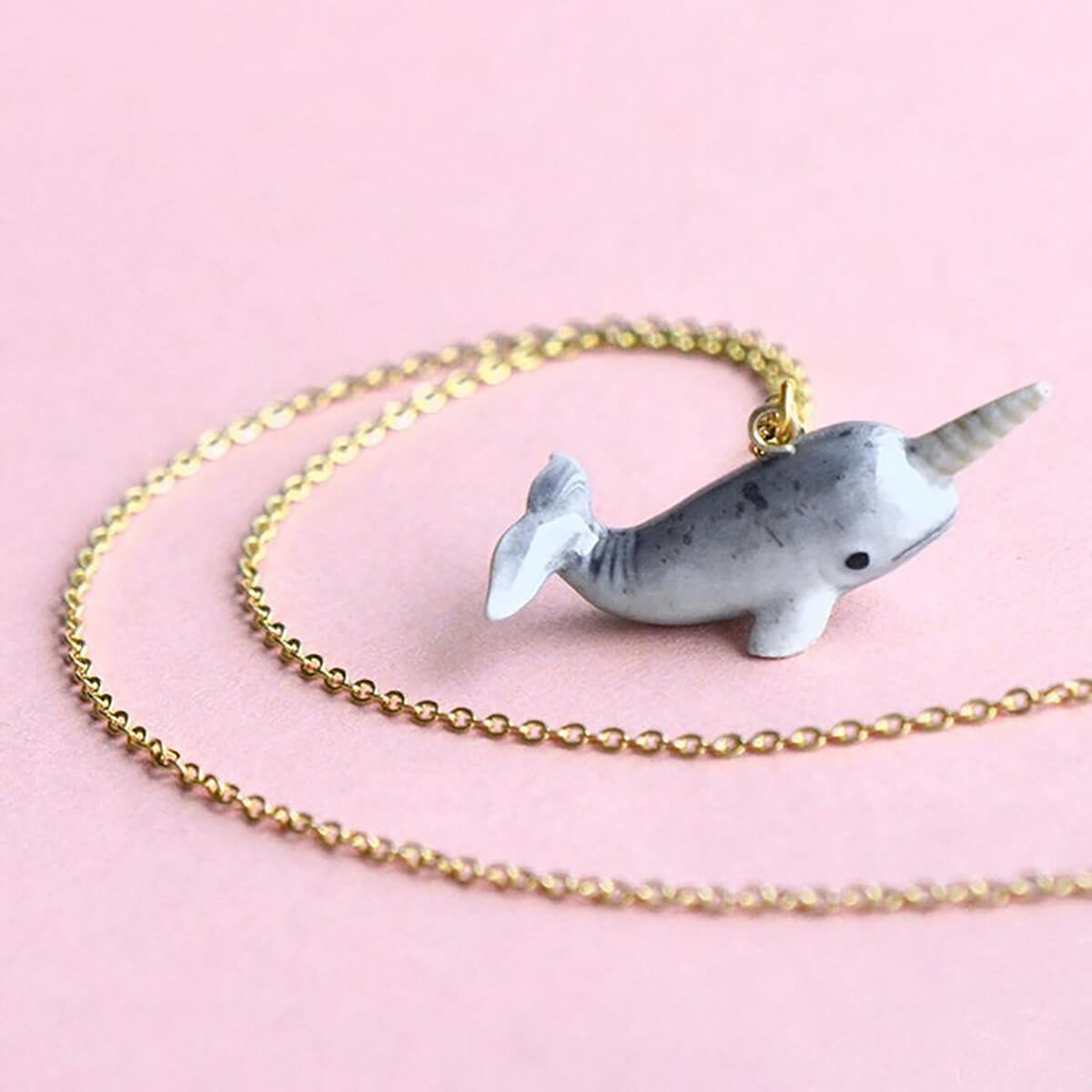 Narwhal ceramic pendant by Camp Hollow. Hand-crafted and meticulously hand-painted porcelain animal pendant on a 24 karat gold-plated stainless steel chain. Comes in its own beautiful story book shaped gift box. Every Camp Hollow wearable is designed as a limited edition, ensuring that your special pendant animal will become a cherished heirloom for generations to come.