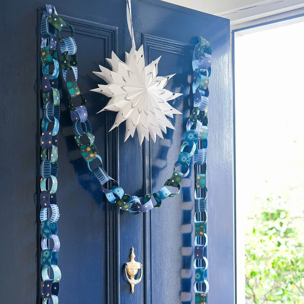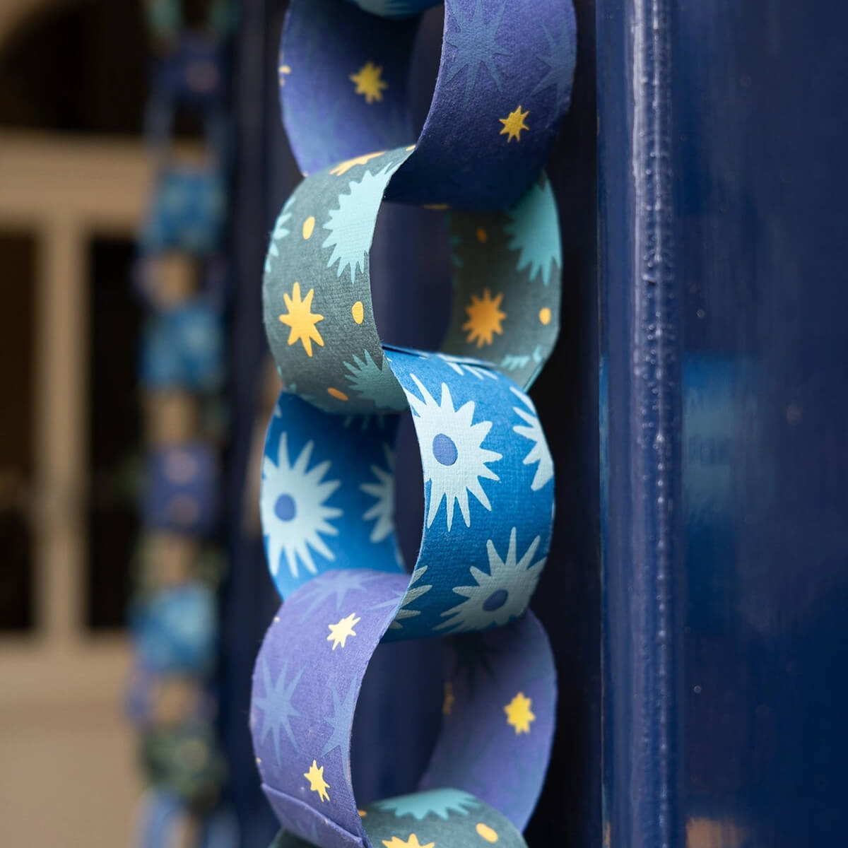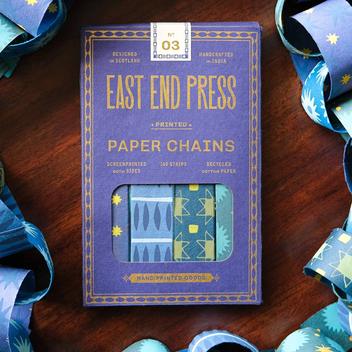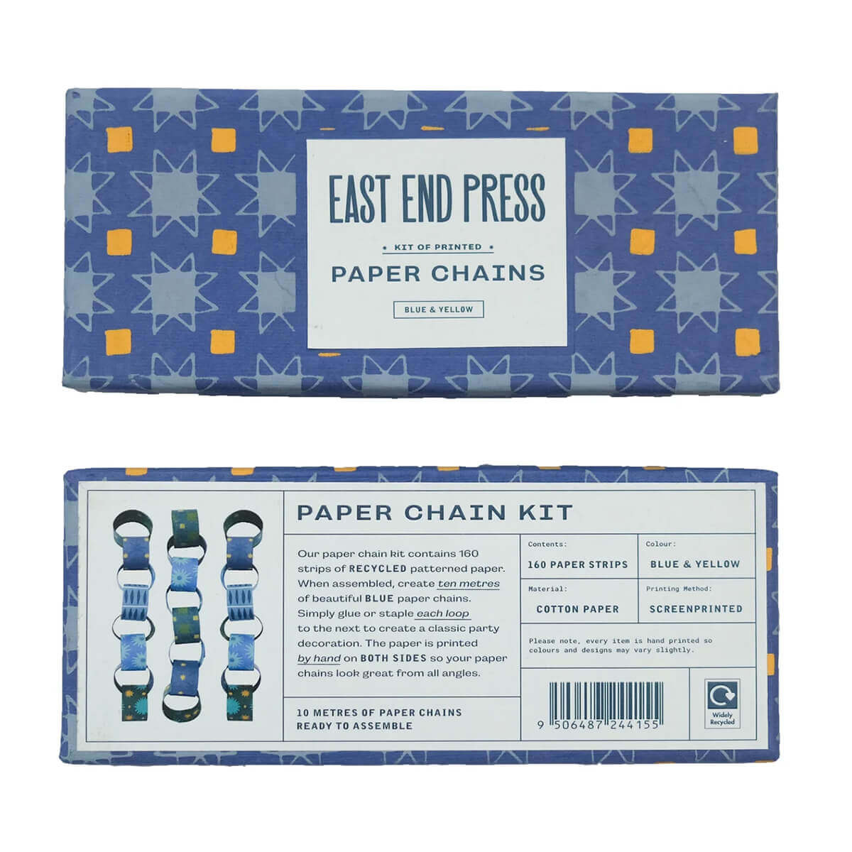 Paper chain kit by East End Press. With 160 gummed strips of hand-printed recycled paper patterned blue and yellow strips. Craft-lovers can create 10-meters of beautiful paper chains — all you need to do is moisten each end with a damp cloth and link them together. These reusable paper strips are eco-friendly, and super-versatile - they're a particularly great way to add a home-made personal touch to the festive season and start your own seasonal traditions with your nearest and dearest.