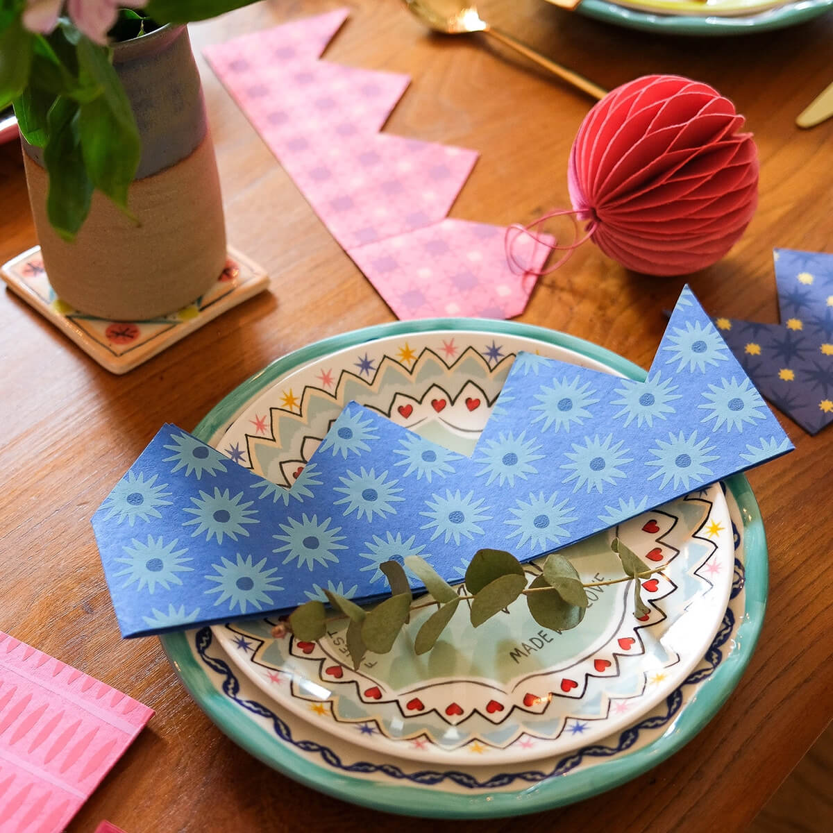 Screen printed by hand. Every paper crown is hand printed so may vary slightly from the photograph, this just adds to the charm!