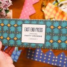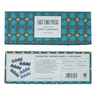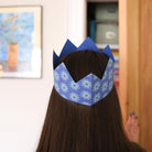 Paper crowns by East End Press. These colourful party crowns are each screen printed by hand with a different pattern onto recycled paper. Each crown is slightly different, but all are shades of blue. They are sturdy enough to be packed away and reused celebration after celebration. The crowns are large enough for adult heads, and perfect for adding some fun to your party!